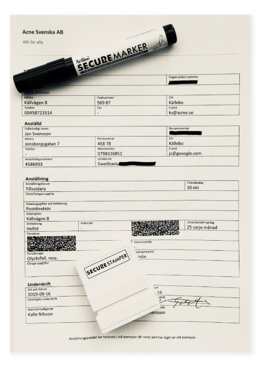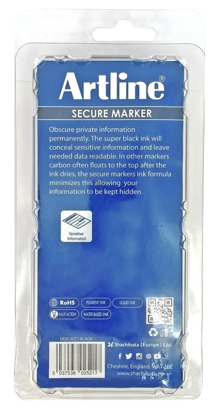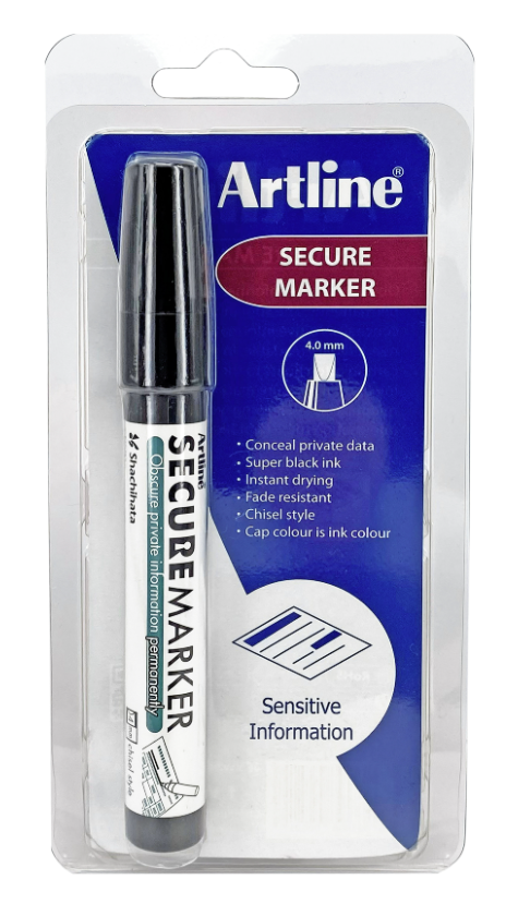 • Artline Secure Markers -tussit ovat äärimmäinen työkalu peittämiseen ja niissä on patentoitu musta mustekoostumus, joka peittää yksityiset tiedot pysyvästi