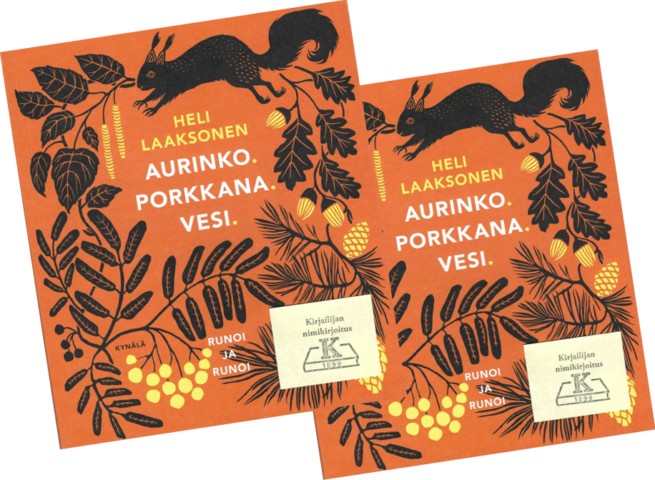 11.2.-20.2.2026 välillä Kansallisessa kirjakaupassa rajoitettu erä Heli Laaksosen signeeraamia Aurinko. Porkkana. Vesi. runokirjoja kaksi yhden hinnalla (norm. 20 e / kpl). 🧡 Aurinko. Porkkana. Vesi. -runokirjan uusi laitos vuodelta 2025 on varsinainen runonystävän lukupaketti. Teos sisältää palkitun Aurinko. Porkkana. Vesi.  -runokokoelman lisäksi valitut runot loppuunmyydystä Poimit sydämeni kirjahyllystä -runokirjasta sekä julkaisemattoman runotehtäväliitteen. 112 sivua.