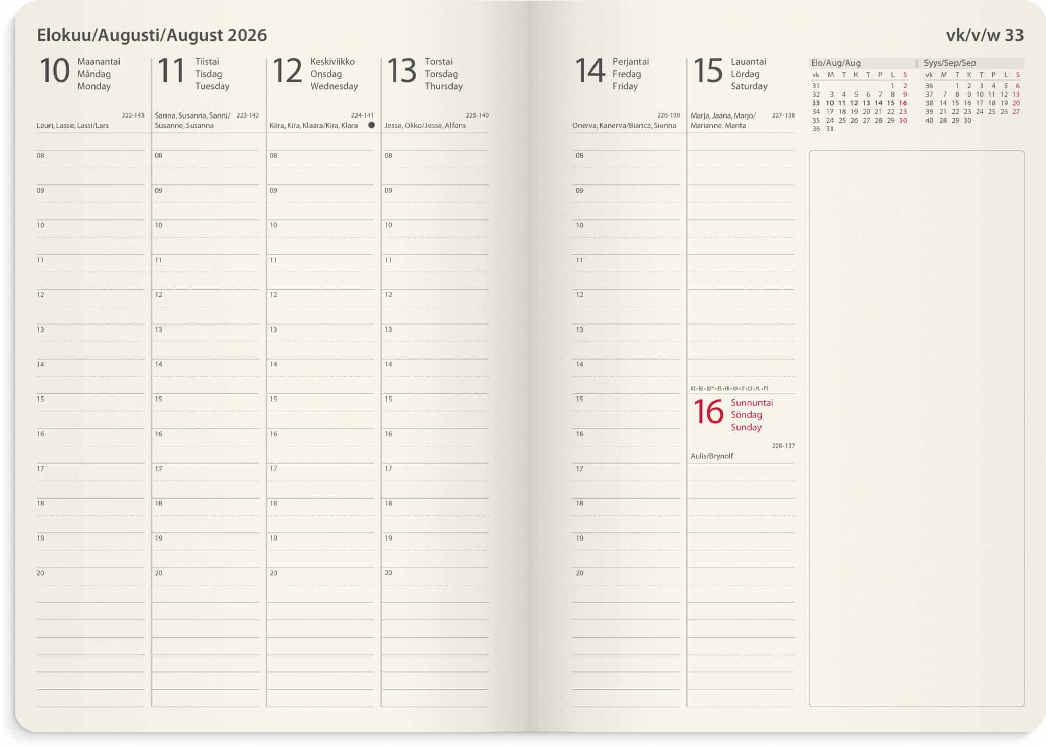 - Kalenterin aukeamalla yksi viikko, tuntijaotus 08-20, palsta muistiinpanoille, kuluvan ja seuraavan kuukauden kalenteritaulukot