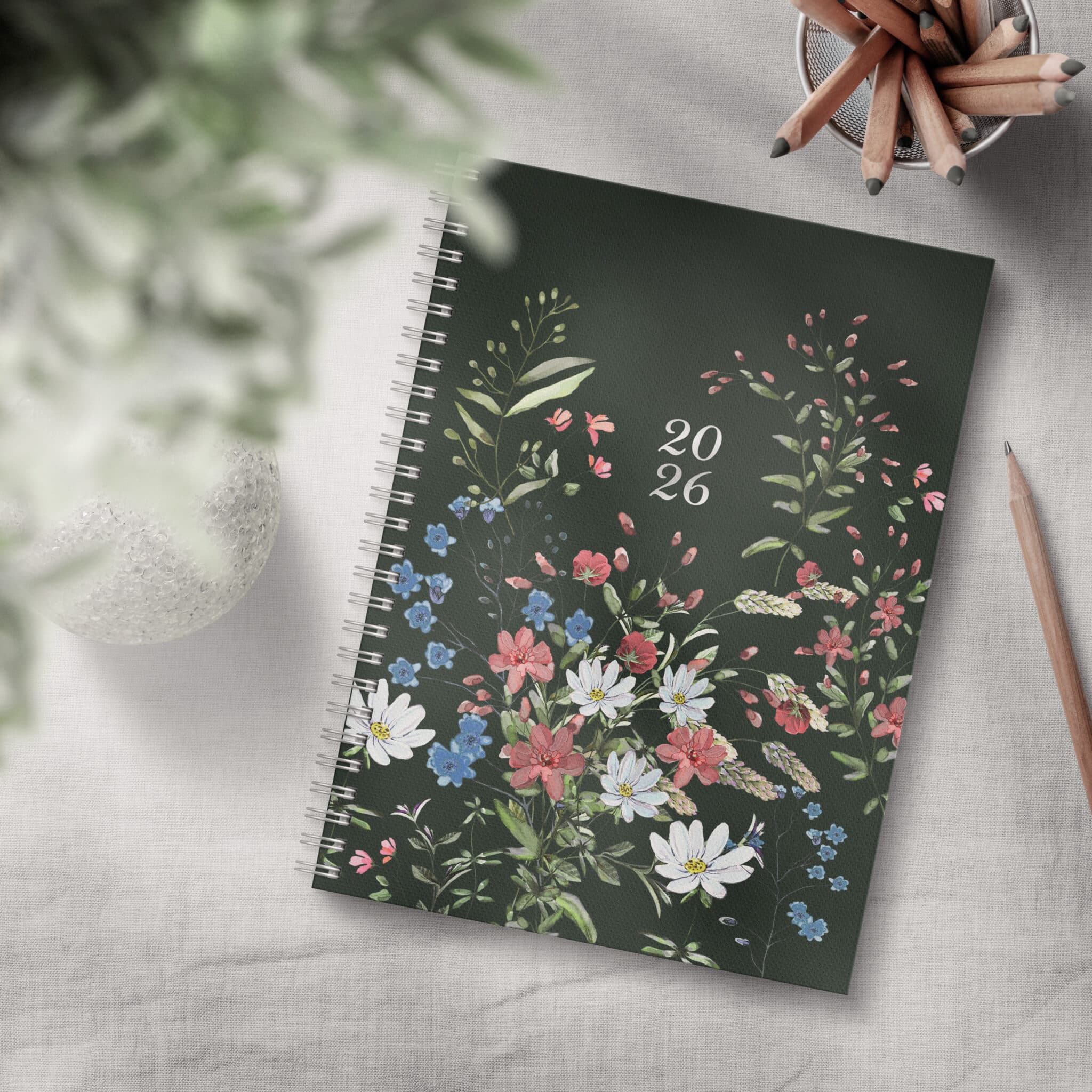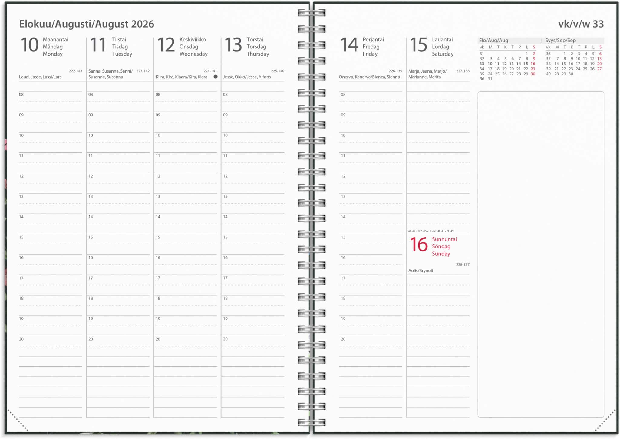 - Kalenterin aukeamalla yksi viikko, tuntijaotus 08-20, palsta muistiinpanoille, kuluvan ja seuraavan kuukauden kalenteritaulukot