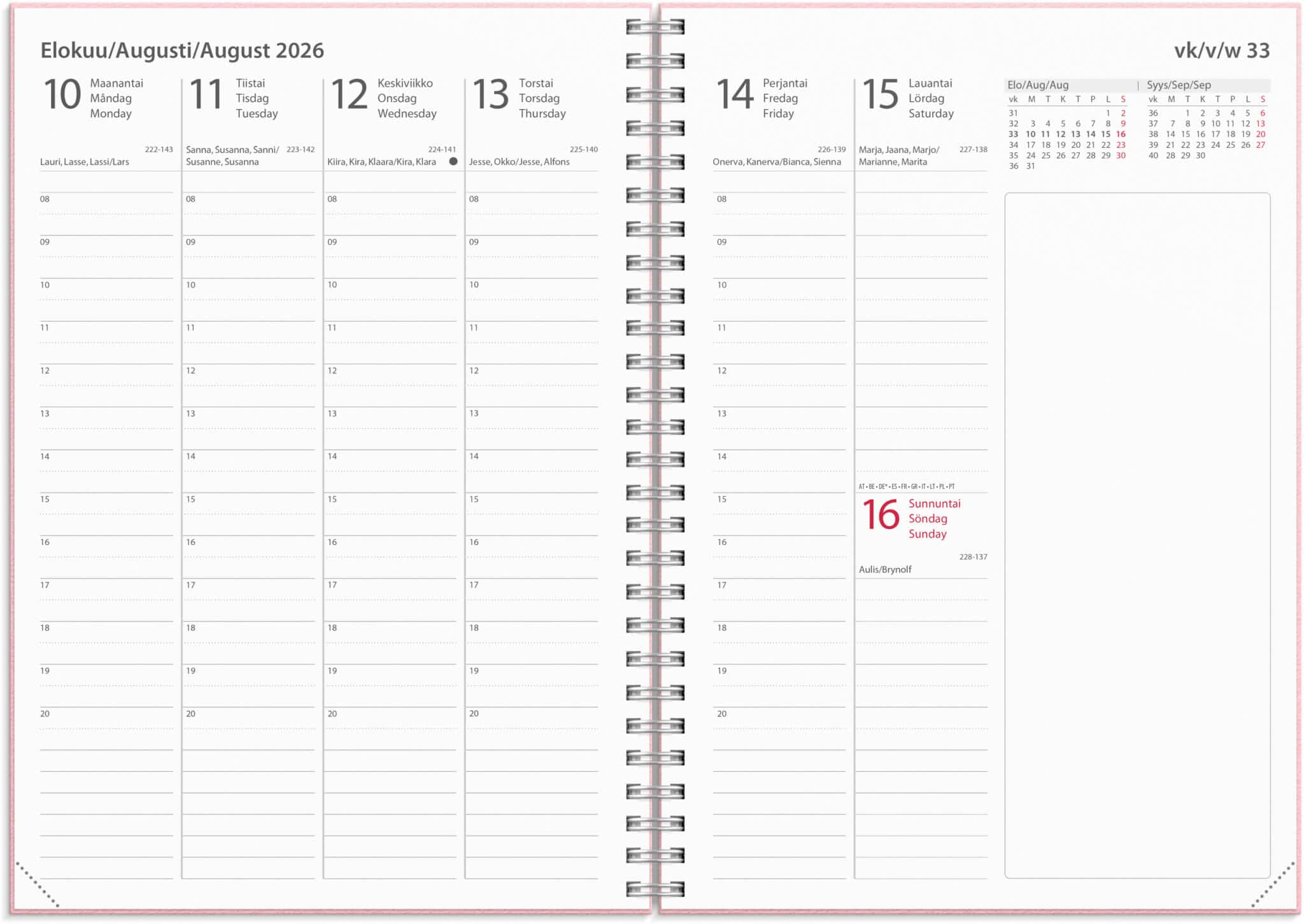 - Kalenterin aukeamalla yksi viikko, tuntijaotus 08-20, palsta muistiinpanoille, kuluvan ja seuraavan kuukauden kalenteritaulukot