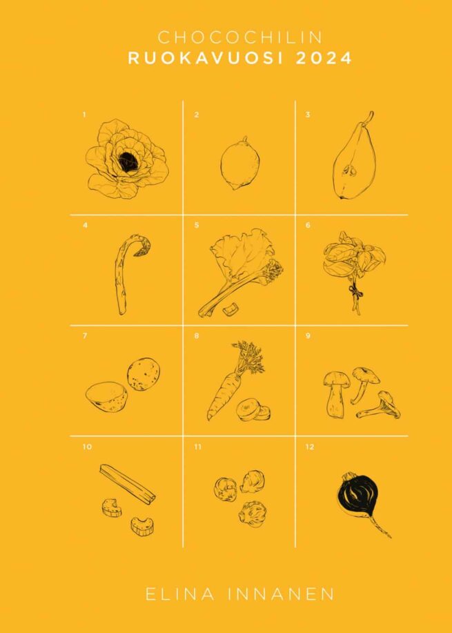 Chocochili-blogistaan ja keittokirjoistaan tunnetun Elina Innasen kalenteri auttaa arjen suunnittelussa, helpottaa ruokalistojen laatimista ja ruokaostosten tekoa sekä tarjoaa tietoa kunkin sesongin parhaista raaka-aineista. Viikko- ja kuukausinäkymien ohella kalenterista löytyy muun muassa vegaanisia reseptejä sekä arkiruokien suunnitteluun tarkoitettuja taulukoita.