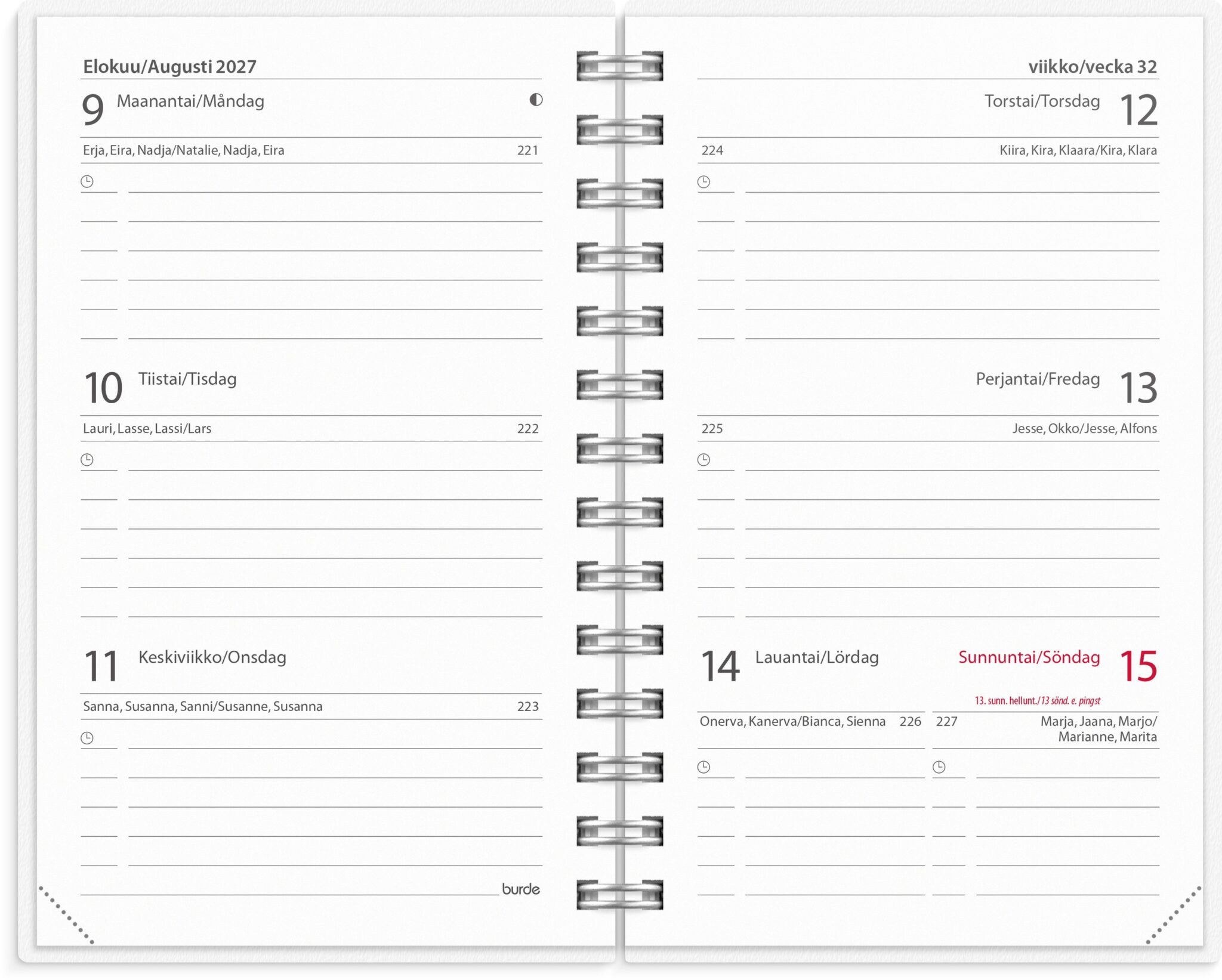 • Kalenteri sisältää nimipäivät, kansalliset pyhäpäivät, liputuspäivät, kuun vaiheet, vuosisuunnitelmat ajalle heinäkuu 2026 – kesäkuu 2028, lukujärjestykset, koetulokset, tietosivut ja kalendaariset tiedot