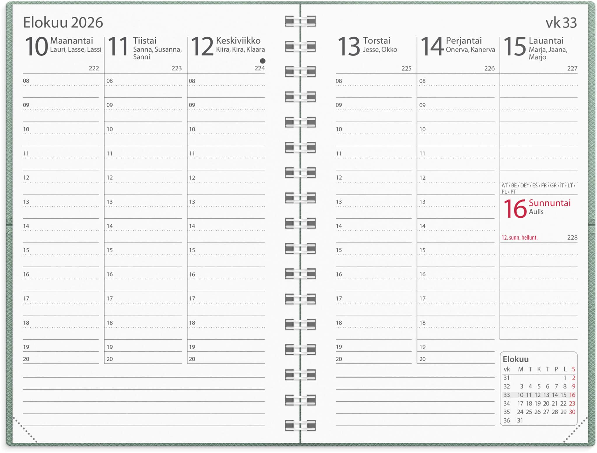 - Kalenteri sisältää nimipäivät, kansalliset pyhäpäivät, liputuspäivät, kuun vaiheet, kalendaariset tiedot, vuosisuunnitelmat kuluvalle ja seuraavalle vuodelle, vuosiruudukot kuluvalle ja seuraavalle vuodelle sekä erillisen muistilehtiön