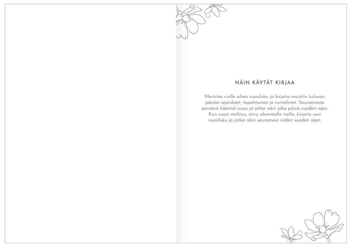 - Päiväkirjassa vuoden jokaiselle päivälle sivu viiden vuoden lyhyitä merkintöjä varten