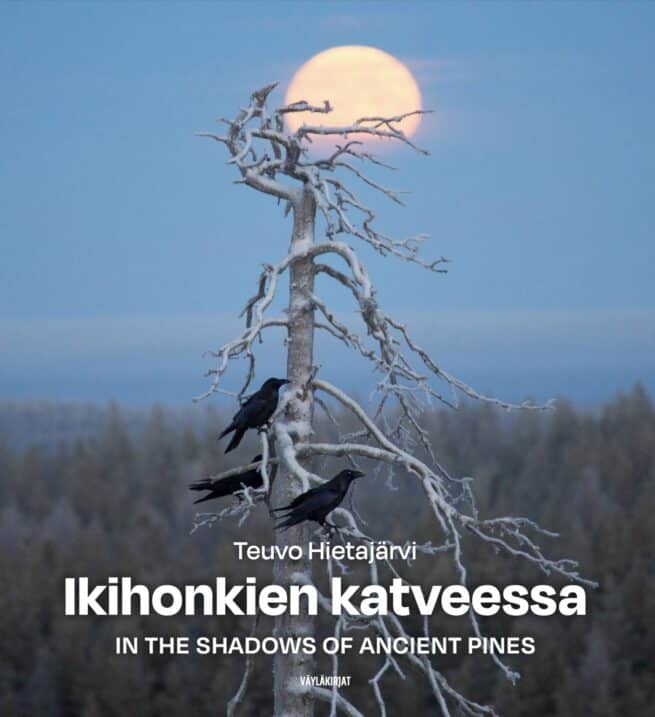 Kirjan kuvatekstit ovat myös englanniksi, samoin kuin esipuhe. Ikihonkien katveessa on luontokuvaaja Teuvo Hietajärven Itä-Lapin luontotrilogian kolmas osa. Se kertoo ainutlaatuisen upein kuvin Itä-Lapin jäljellä olevista luonnontilaisista ikimetsistä ja niiden vuodenkierrosta. Keskeisessä osassa on ikihonka eli kelo. Se on metsien komistukseksi hitaasti syntyvä luonnonvara, jota on nähtävillä yhä vähemmän. ´ Kirja perustuu pääosin Värriön tutkimusaseman tutkimuksiin ja aseman luomiin mahdollisuuksiin kuvata ikimetsissä. Myös itäisen Lapin muita osia eläimistöineen on runsaasti esitteillä kirjassa. Kirjassa otetaan kantaa myös metsien käyttöön ja ihmisen vastuuseen niistä Luomakunnan kruununa. Teuvo Hietajärven luontokuvakirjojen trilogian aikaisemmat osat: Erämaa elää – Metson matkassa Itä-Lapin kairoissa, Väyläkirjat 2017; Valkeuden valtakunta : Tutkimusmatka tykkylumeen Itä-Lapin lakimetsissä, Väyläkirjat 2021. Teuvo Hietajärvis new book In the shadows of ancient pines” is the third part of the nature trilogy about the primeval forests of Eastern Lapland, natural forests and their annual cycle. An important part of the book is about the ancient pine snags, which are a diminishing, slow-growing natural resource and the forest’s majesty. The book is largely based on the studies of the Värriö research station and the opportunities created by the station to photograph in old-growth forests. Other parts of Eastern Lapland with their fauna are also presented in the book. Book also takes a stand on the use of forests and humanity’s responsibility for them as the “Pinnacle of Creation”.