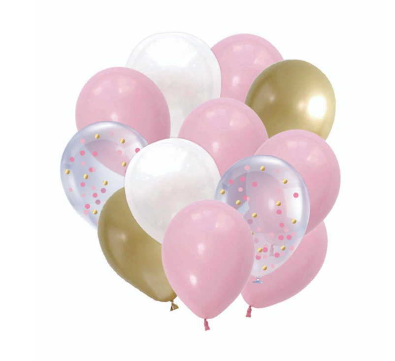 - Pakkaus sisältää valkoisia, pinkkejä ja kullanvärisiä ilmapalloja, sekä kirkkaita, joiden sisällä on konfettia