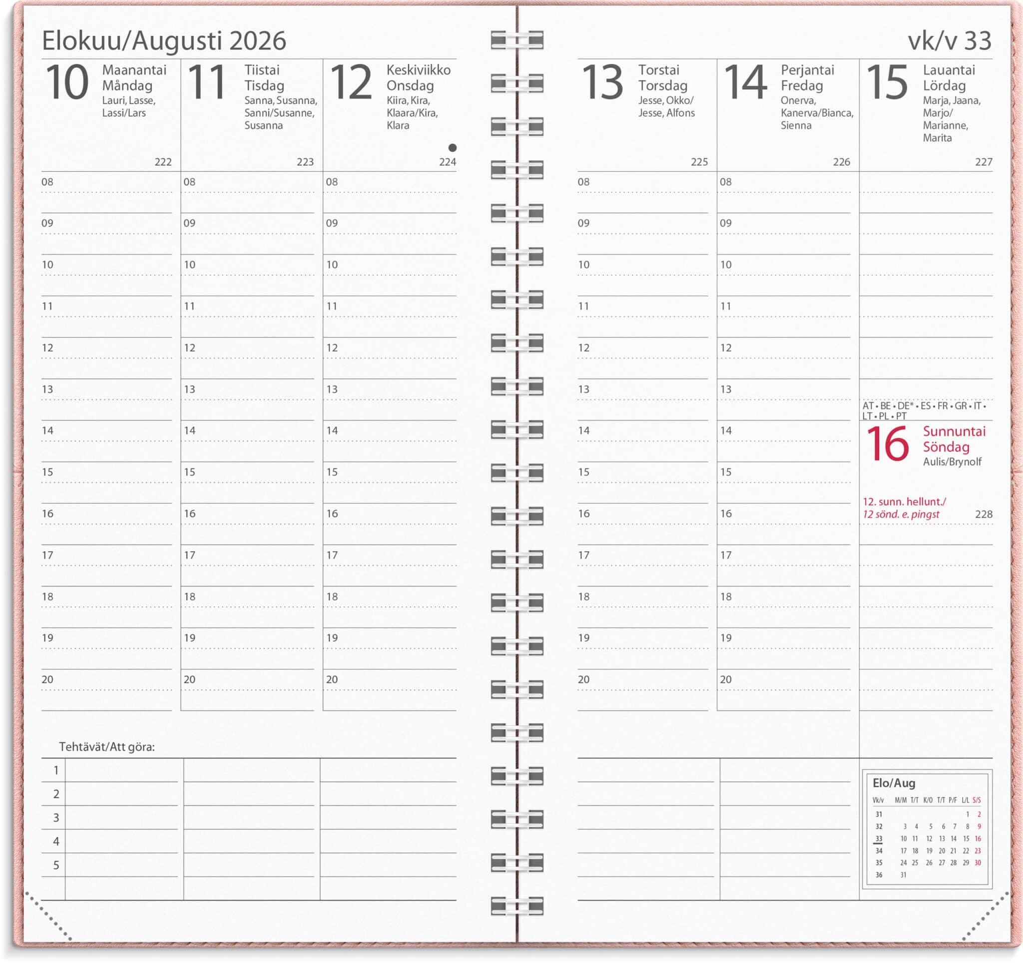 - Kalenteri sisältää nimipäivät, kansalliset pyhäpäivät, liputuspäivät, kuun vaiheet, vuosisuunnitelmat kuluvalle ja seuraavalle vuodelle, vuosiruudukot kuluvalle ja seuraavalle vuodelle, yleiset pyhäpäivät Euroopassa, kalendaariset tiedot, Suomen kartta ja välimatkataulukon sekä erillisen puhelinmuistion
