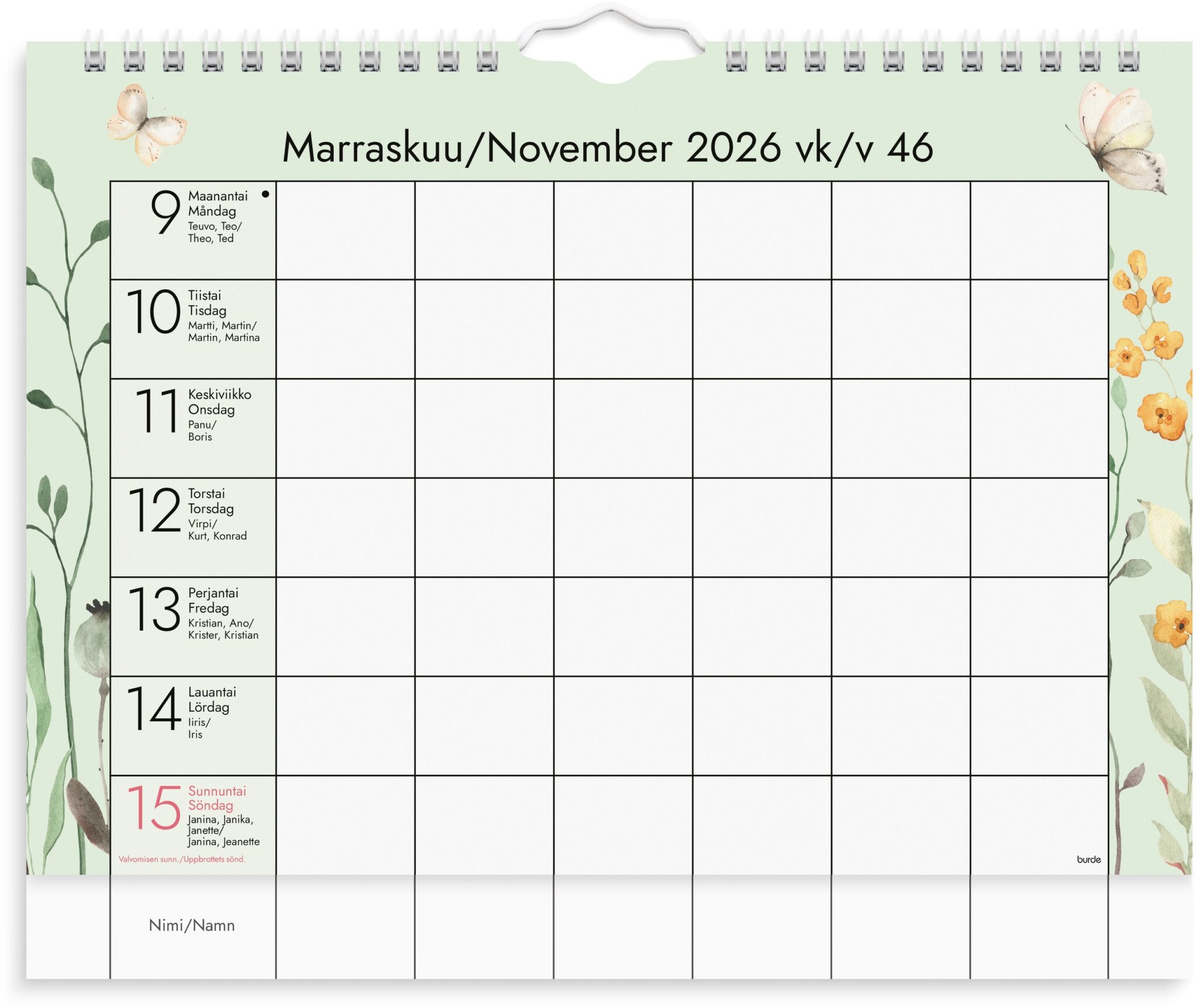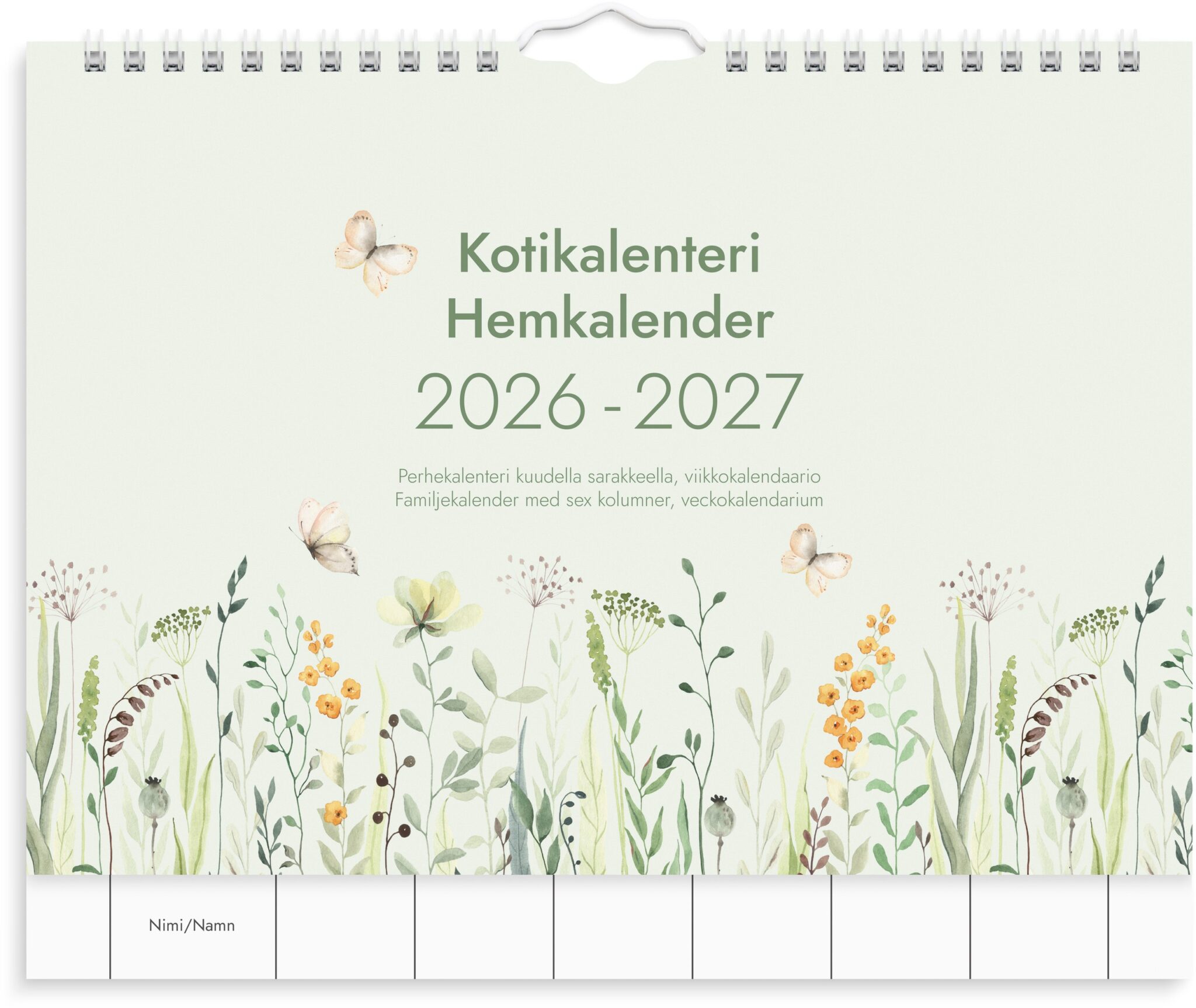 - Perhekalenteri kuudella sarakkeella, johon voi kirjata koko perheen menemiset