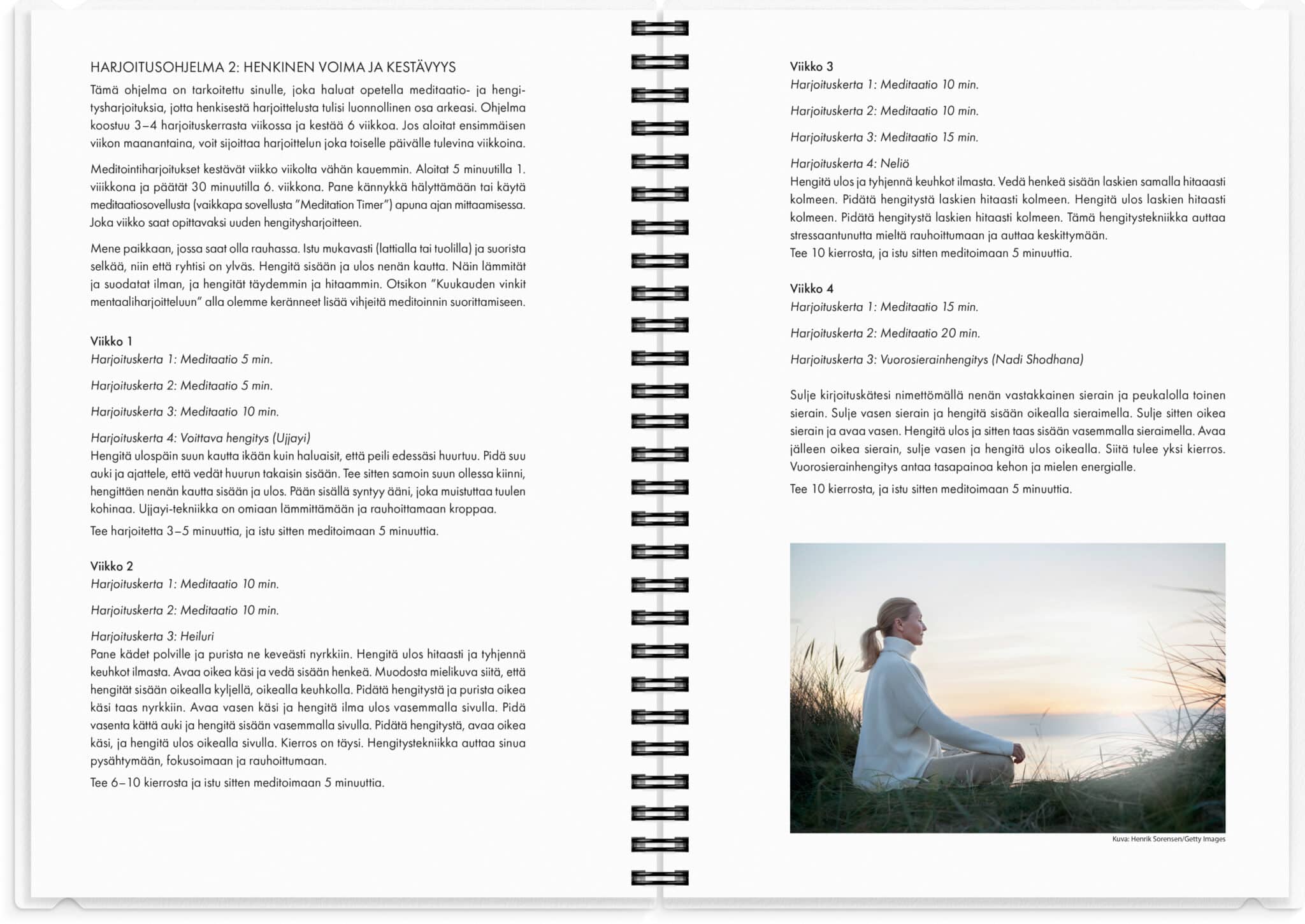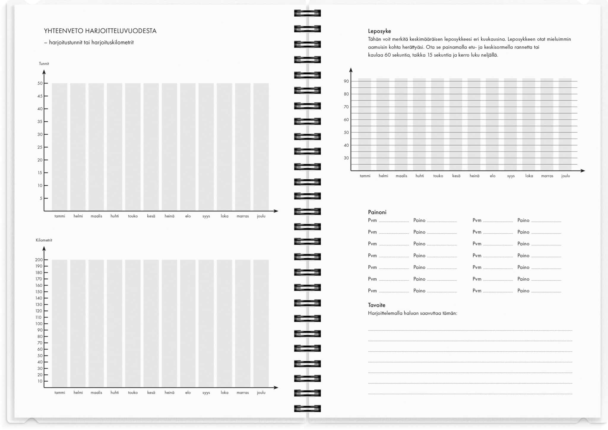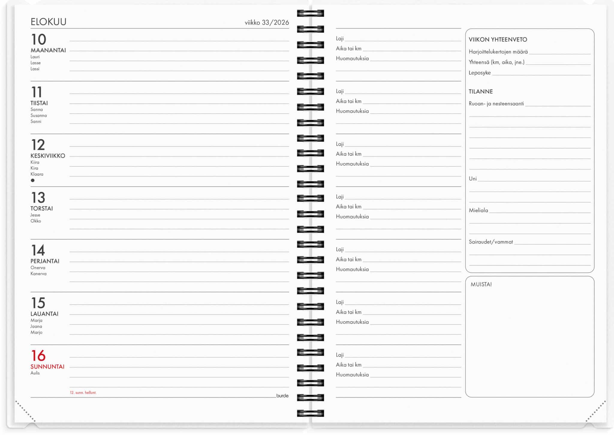 • Kalenterin aukeamalla yksi viikko ja harrastesivu johon voi merkitä päivittäiset liikuntasuoritukset