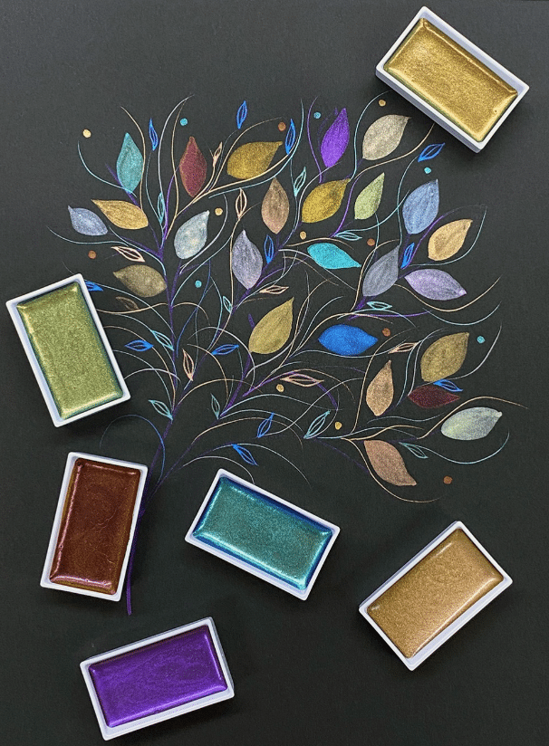 - Nämä korkeakaliiperiset akvarellivärit ovat sekoitettavissa ja niissä on kermainen-pehmeä tunne, joka näkyy tummalla paperilla