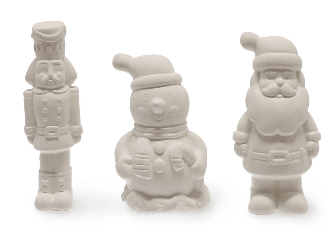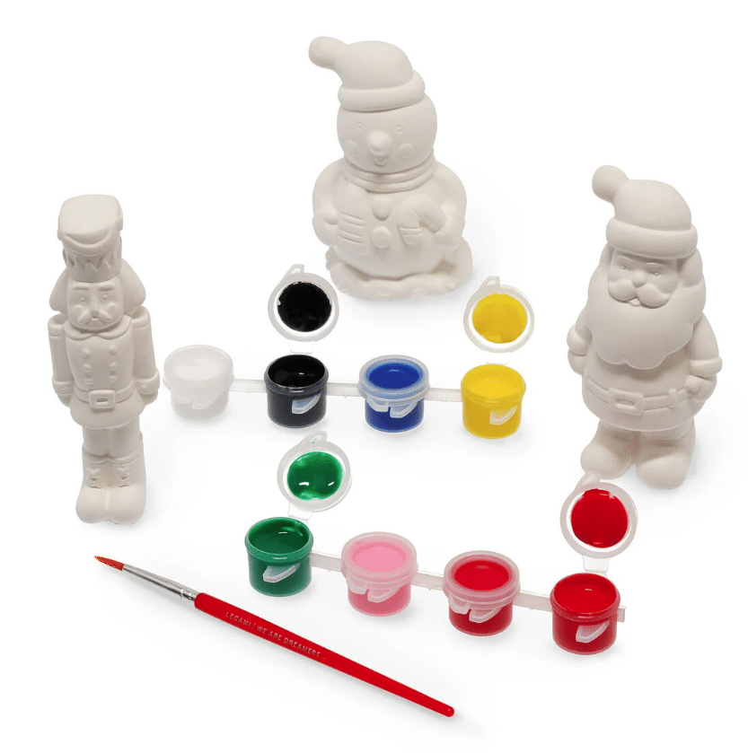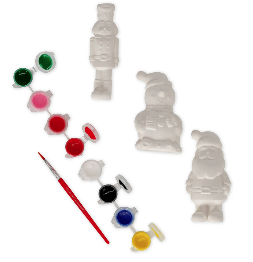 - Sisältää: 3 muovihahmoa (pähkinänsärkijä, lumiukko, joulupukki), temperavärejä 7 värissä & 1 sivellin