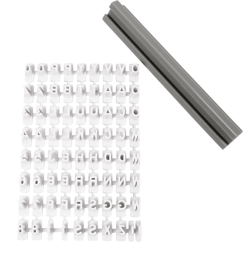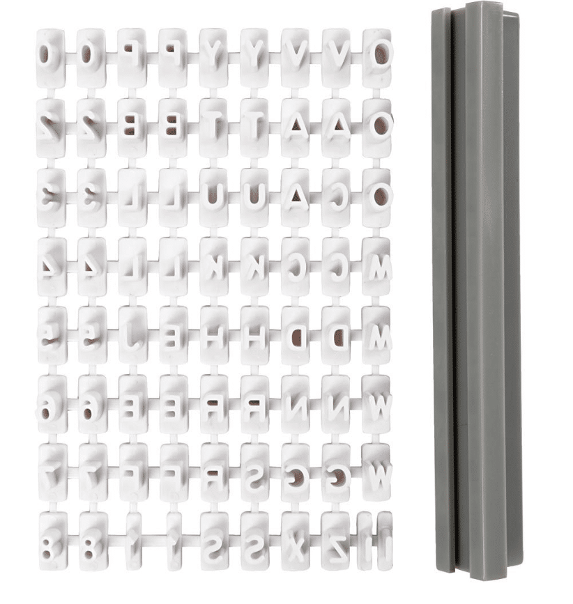 - Lajitelma numero- ja kirjainleimasimia kovasta muovista