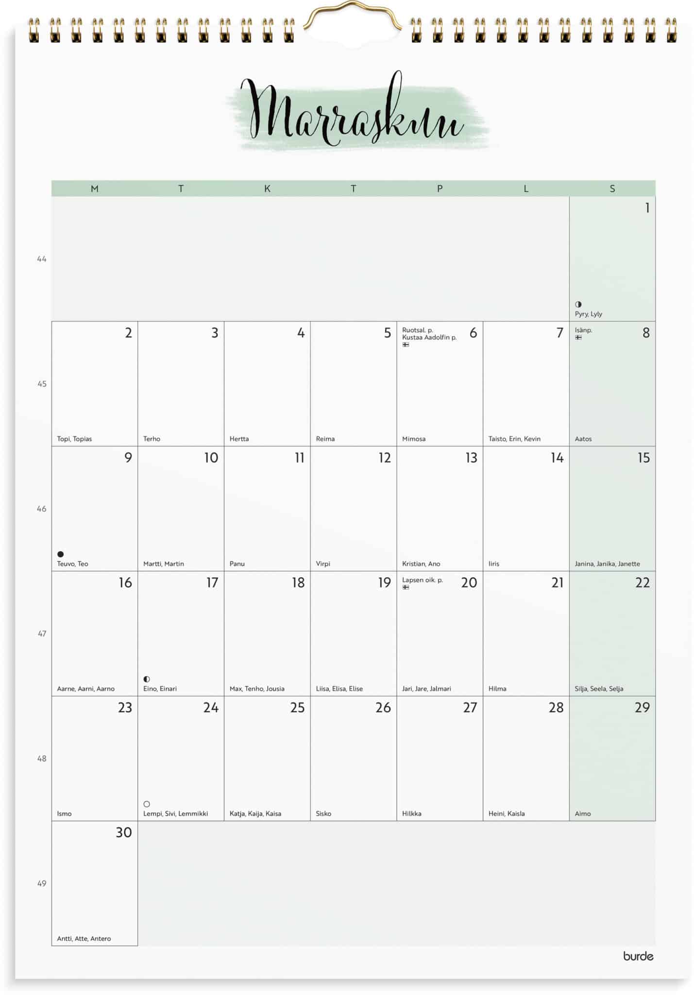 • Kalenteri sisältää nimipäivät, liputuspäivät, juhlapyhät ja kuun vaiheet