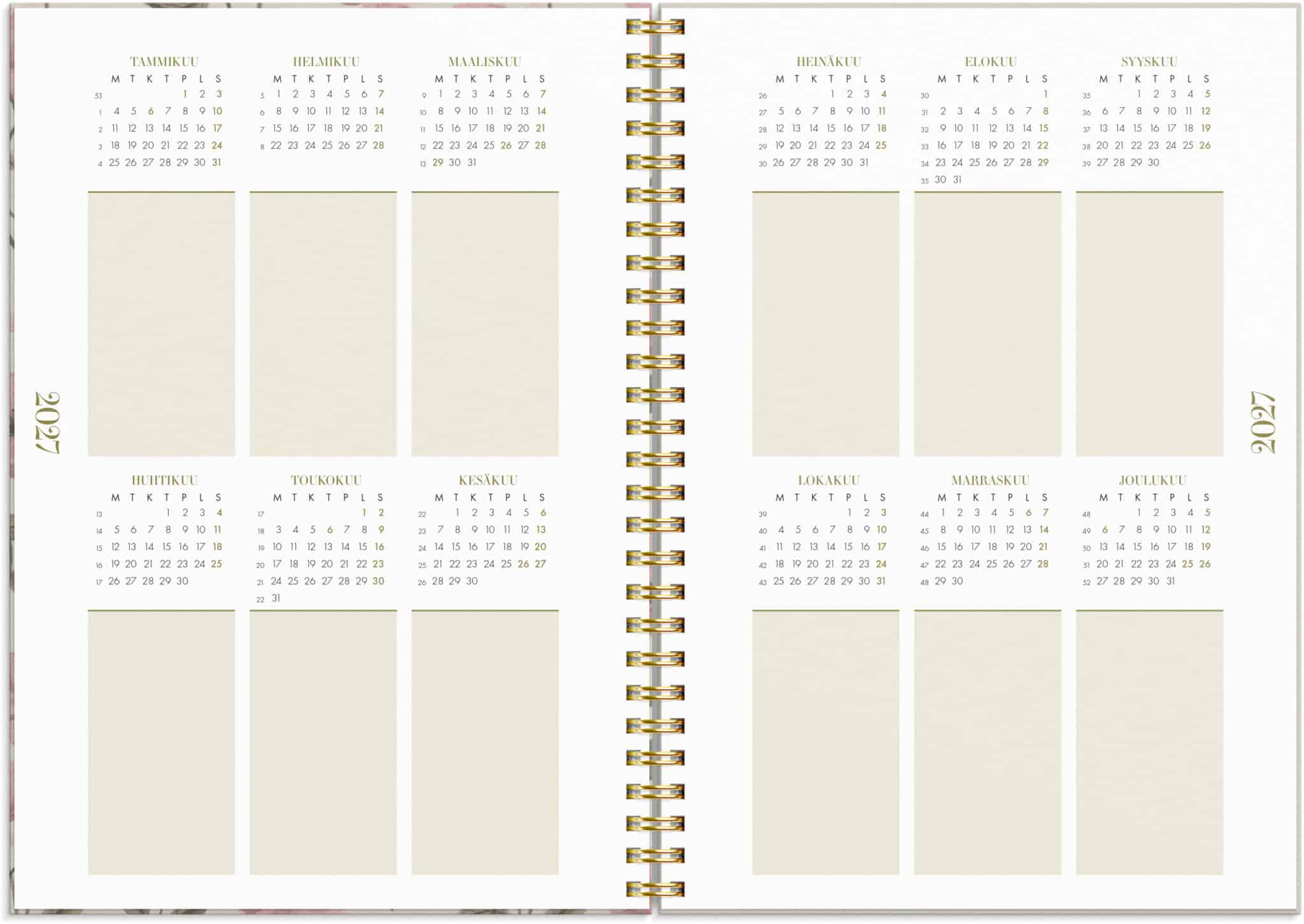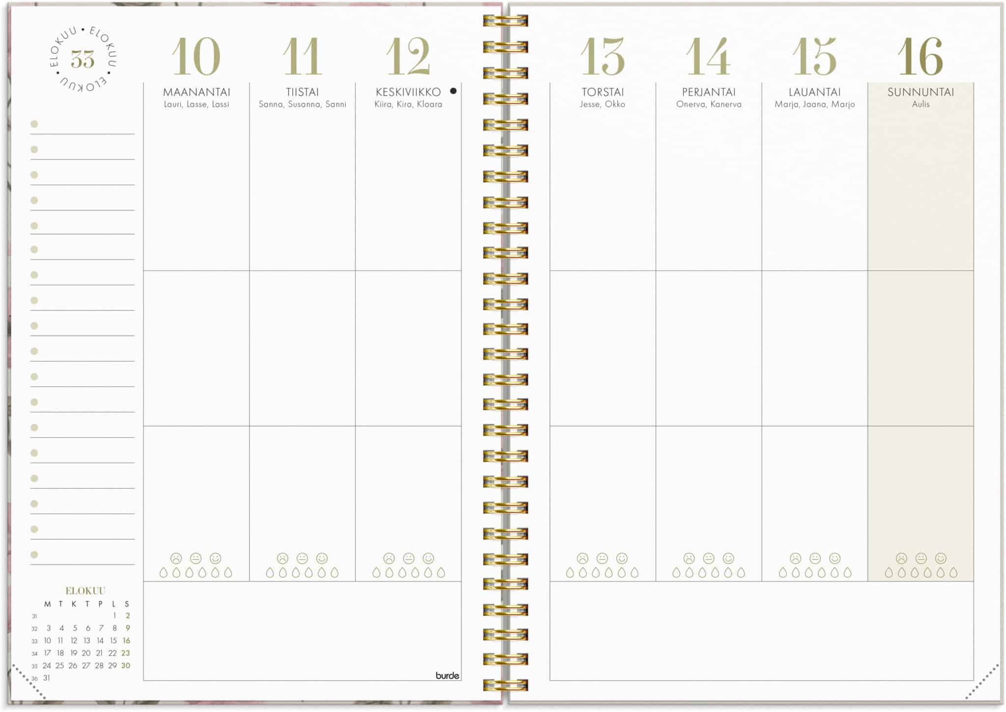 - Henkilökohtainen kalenteri, joka keskittyy hyvinvointiisi ja tasapainoosi ja jossa on erilaisia työkaluja viikkosuunnitteluun