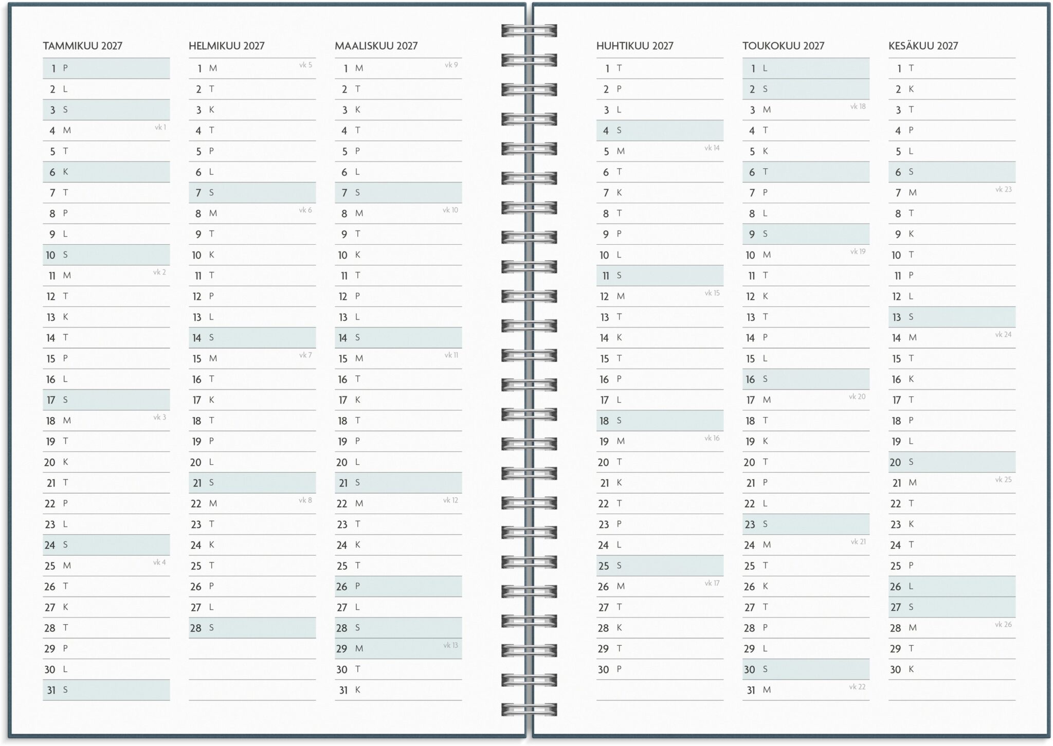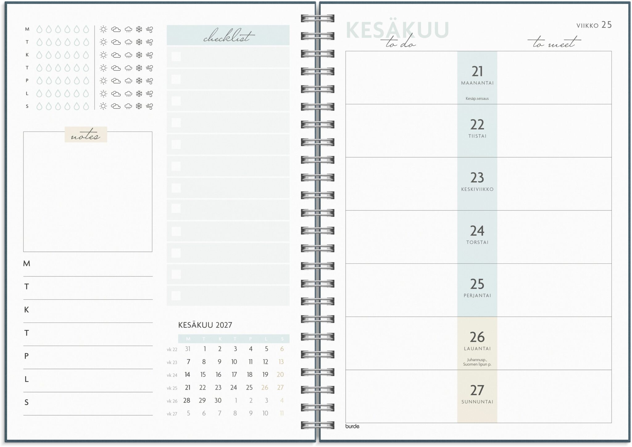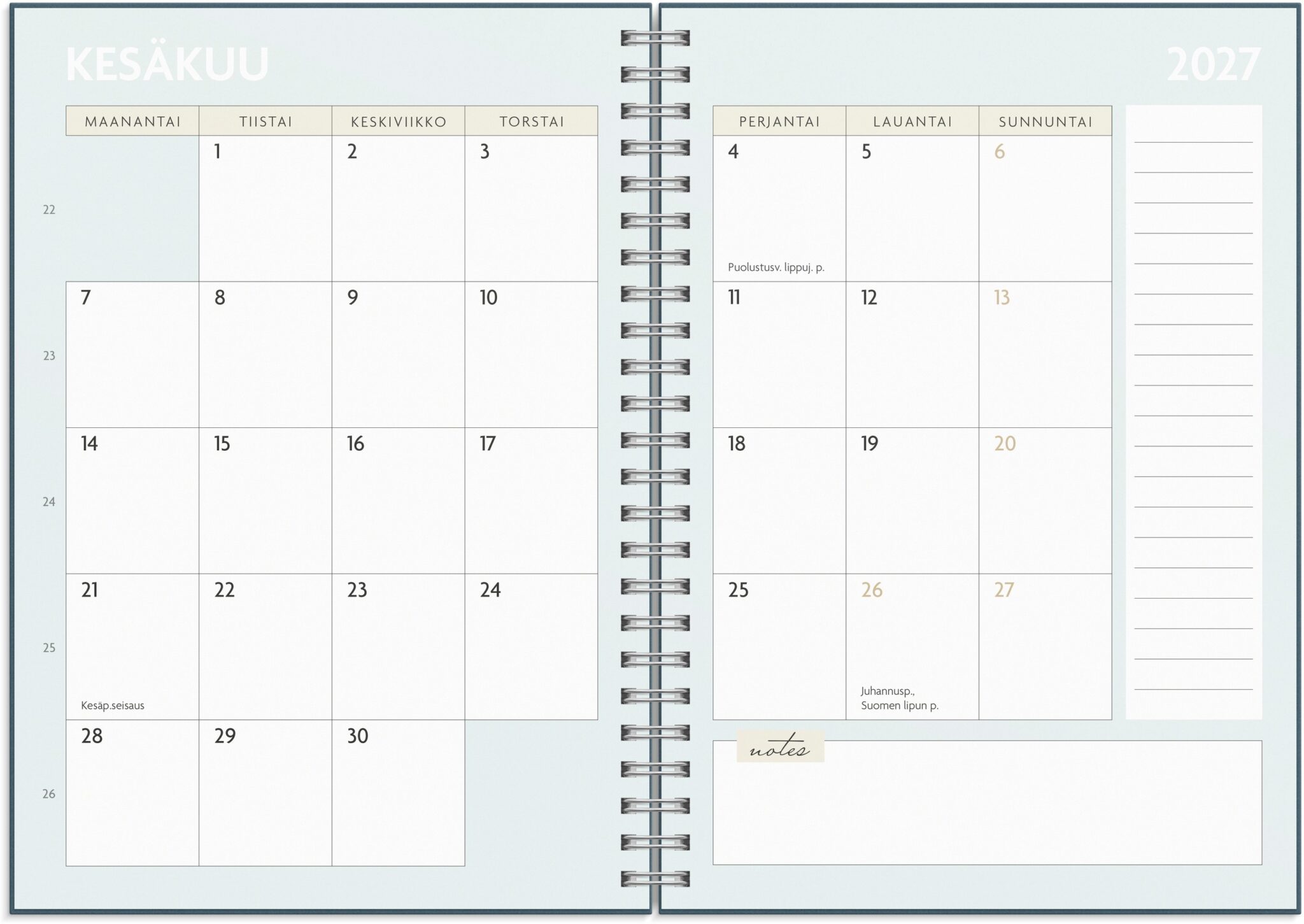 - Kalenteri sisältää juhlapyhät, liputuspäivät ja vuosisuunnitelmat ajalle heinäkuu 2026 – kesäkuu 2027