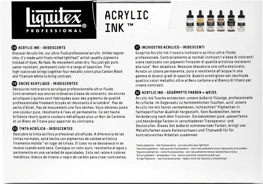 - Liquitex Acrylic Ink! on korkealuokkainen taiteilijatason muste, joka soveltuu kaikille mustetekniikoille