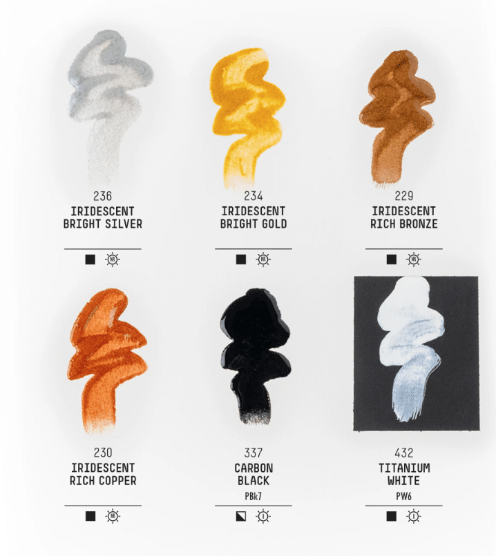 - Sisältyvät värit: Iridescent Bright Silver, Iridescent Bright Gold, Iridescent Rich Bronze, Iridescent Rich Copper, Carbon Black & Titanium White