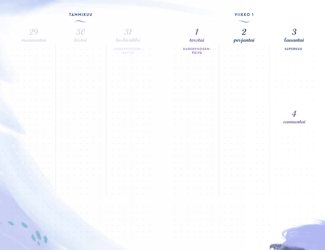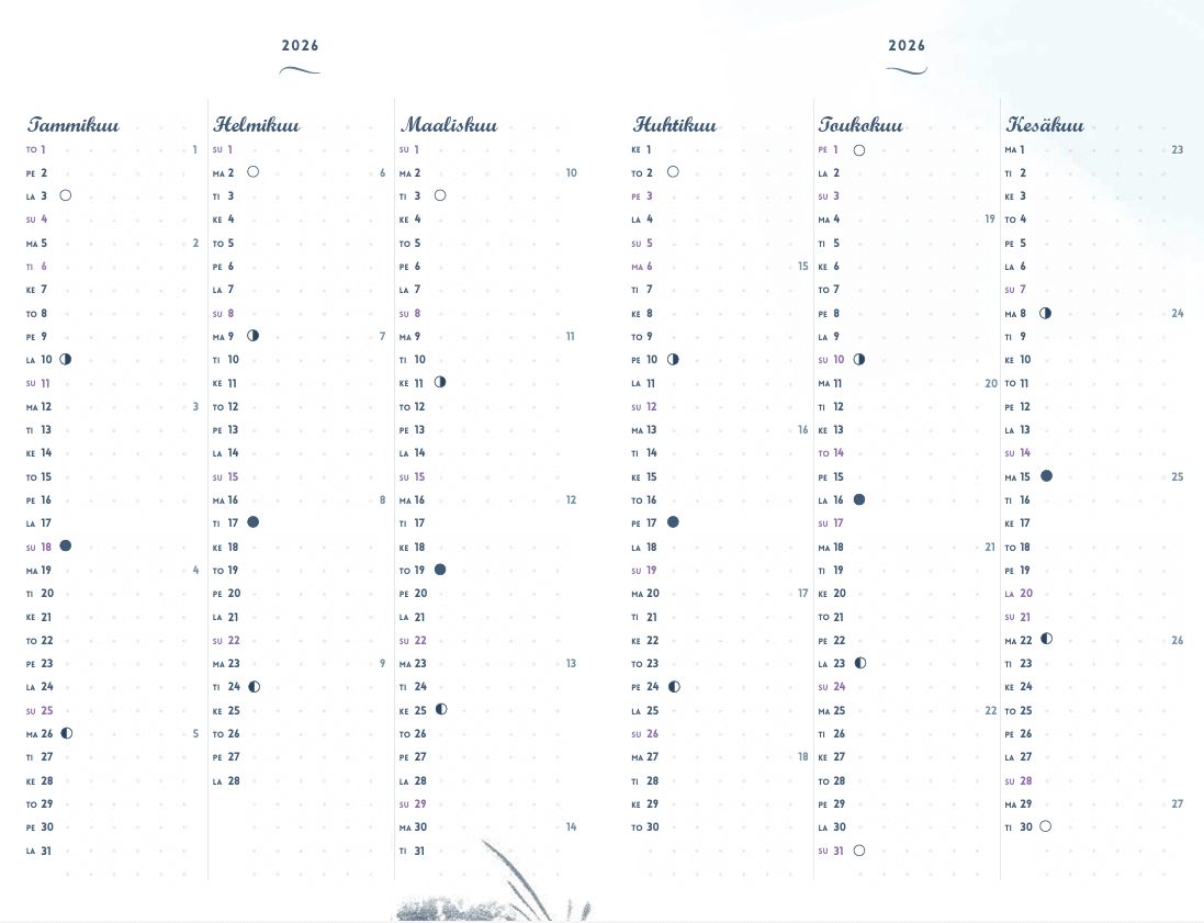 Kalenterin graafisesta ilmeestä vastaa helsinkiläinen graafinen suunnittelija ja kuvittaja Satu Kontinen.