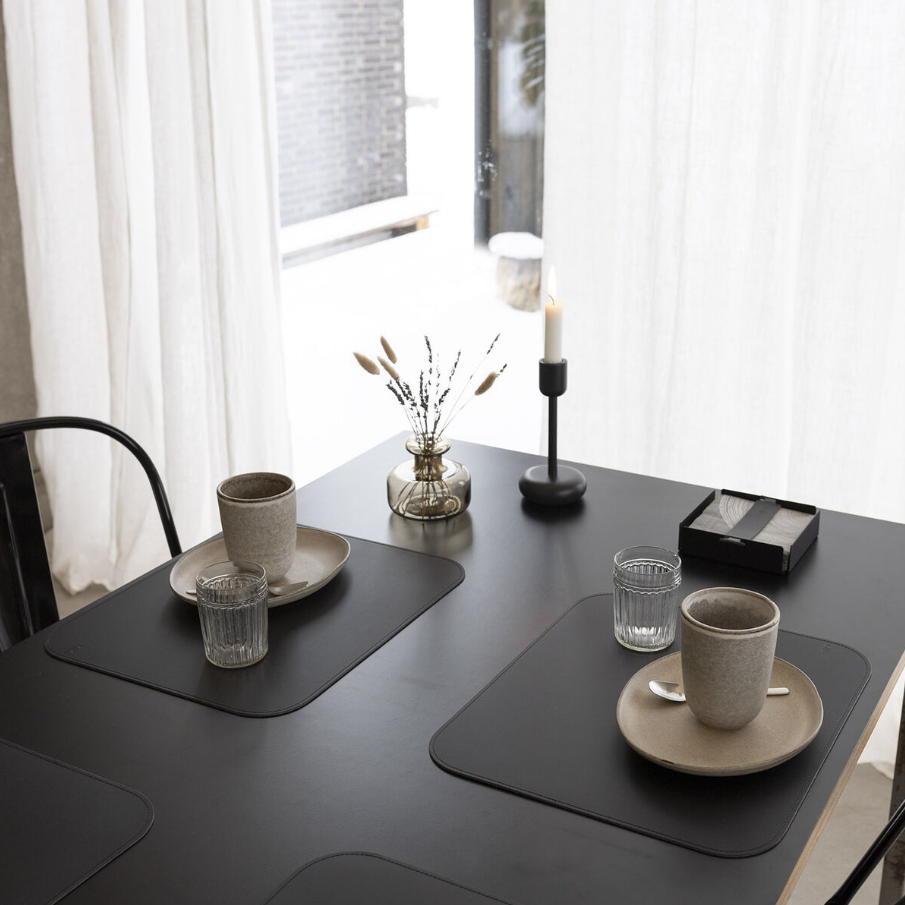 - Laadukkaat, uusionahkaiset pöytätabletit viimeistelevät kattauksen suojaten samalla pöydän pintaa tahroilta ja kolhuilta