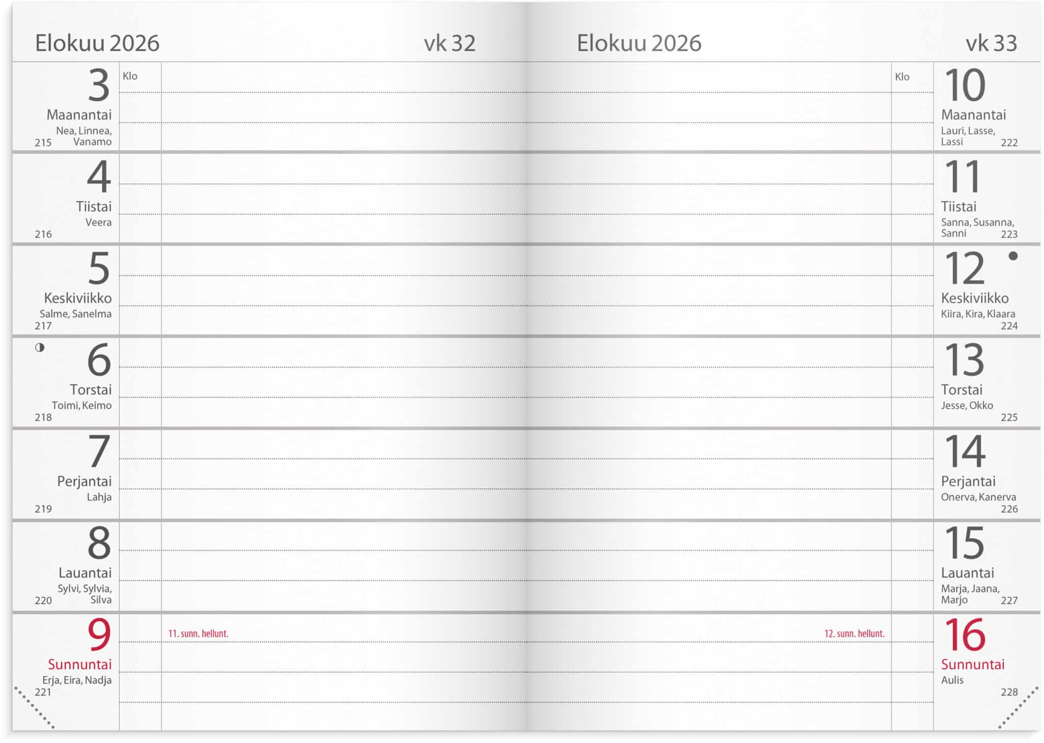 • Kalenterin aukeamalla kaksi viikkoa
