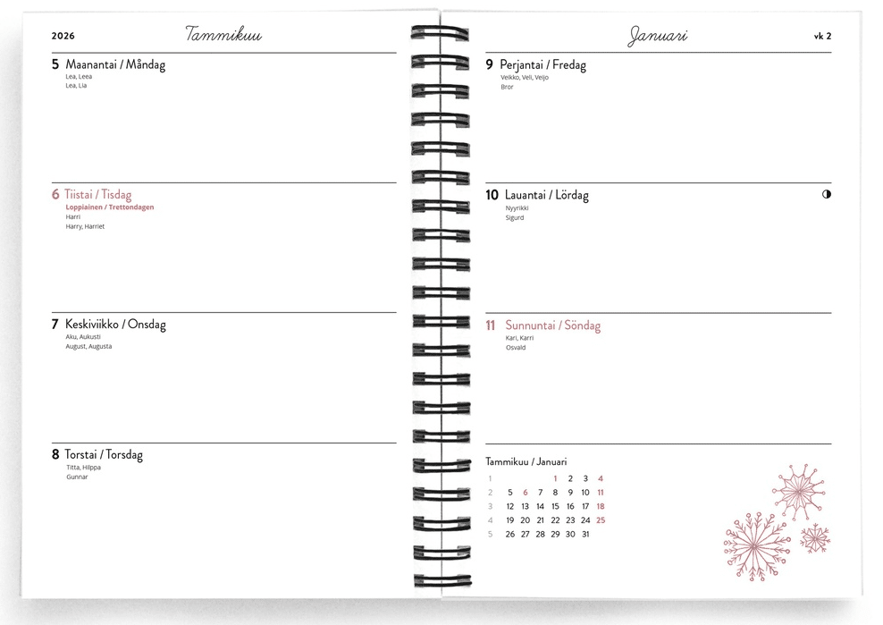 - Kovakantinen, kierreselkäinen viikkopäivyri vuodelle 2026 Mira Malliuksen kuvituksilla