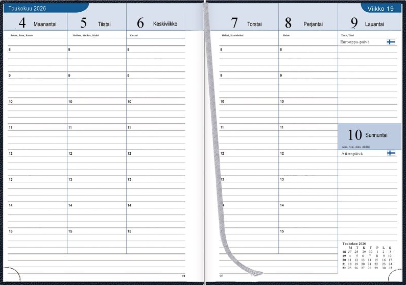 - Päiväkirjan käyttöä helpottaa alakulman repäisyreuna ja lankasidotussa päiväkirjassa myös lukunauha