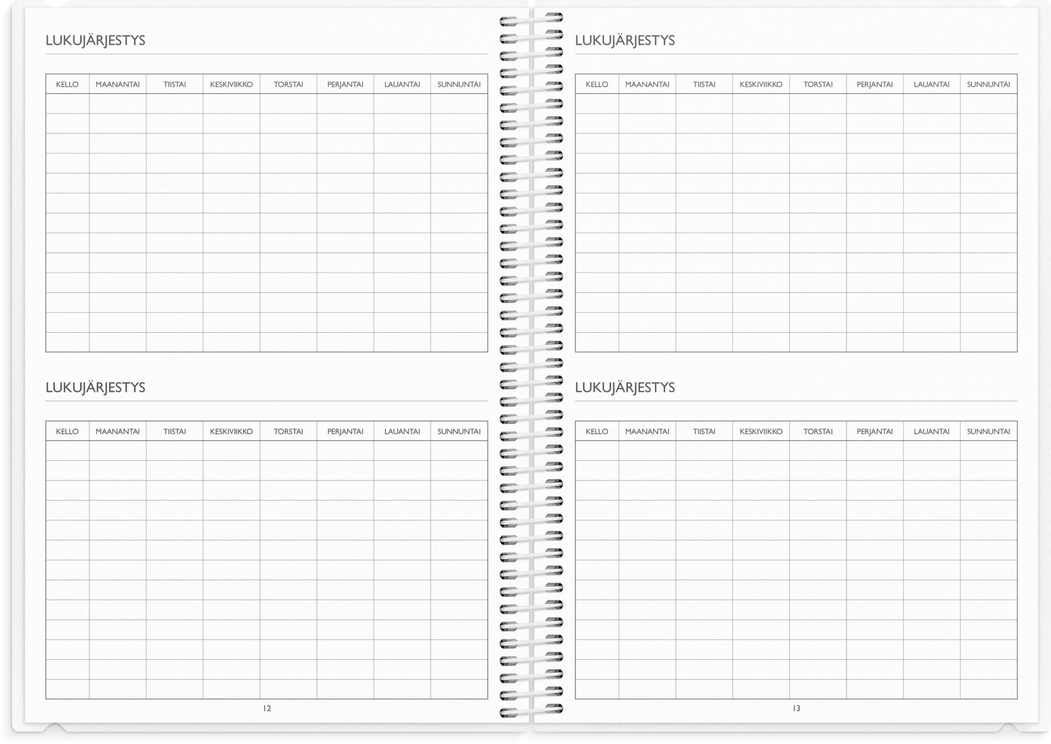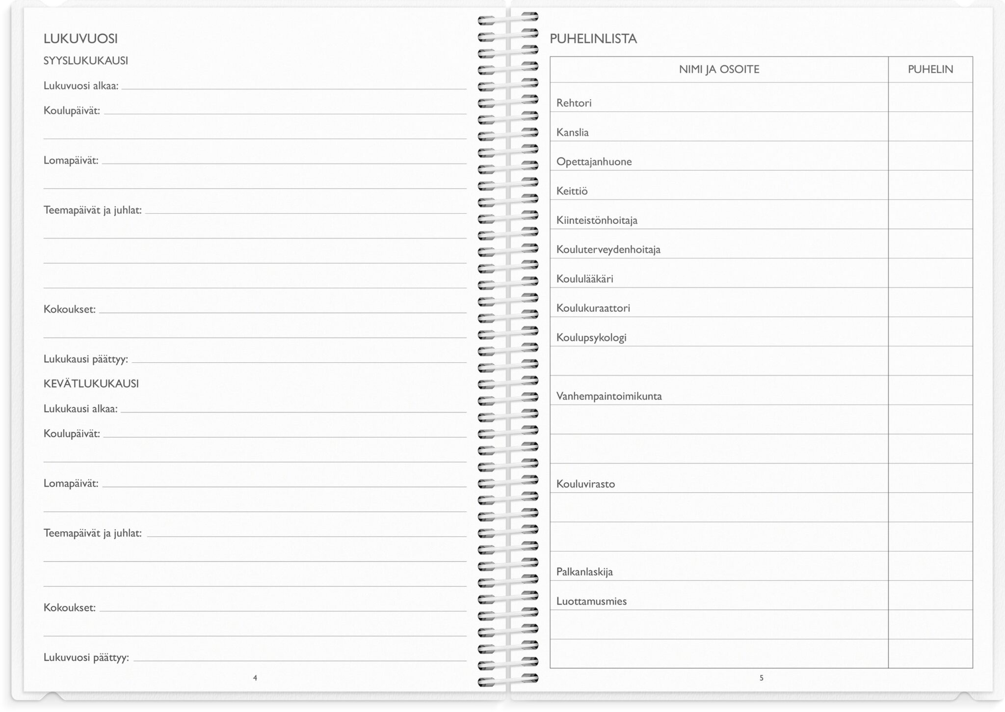 • Kalenteri sisältää nimipäivät, kansalliset pyhäpäivät, liputuspäivät, vuosisuunnitelmat ajalle heinäkuu 2026 – kesäkuu 2028, lukujärjestykset, oppilassivut, poissaolo- ja arviointitaulukot