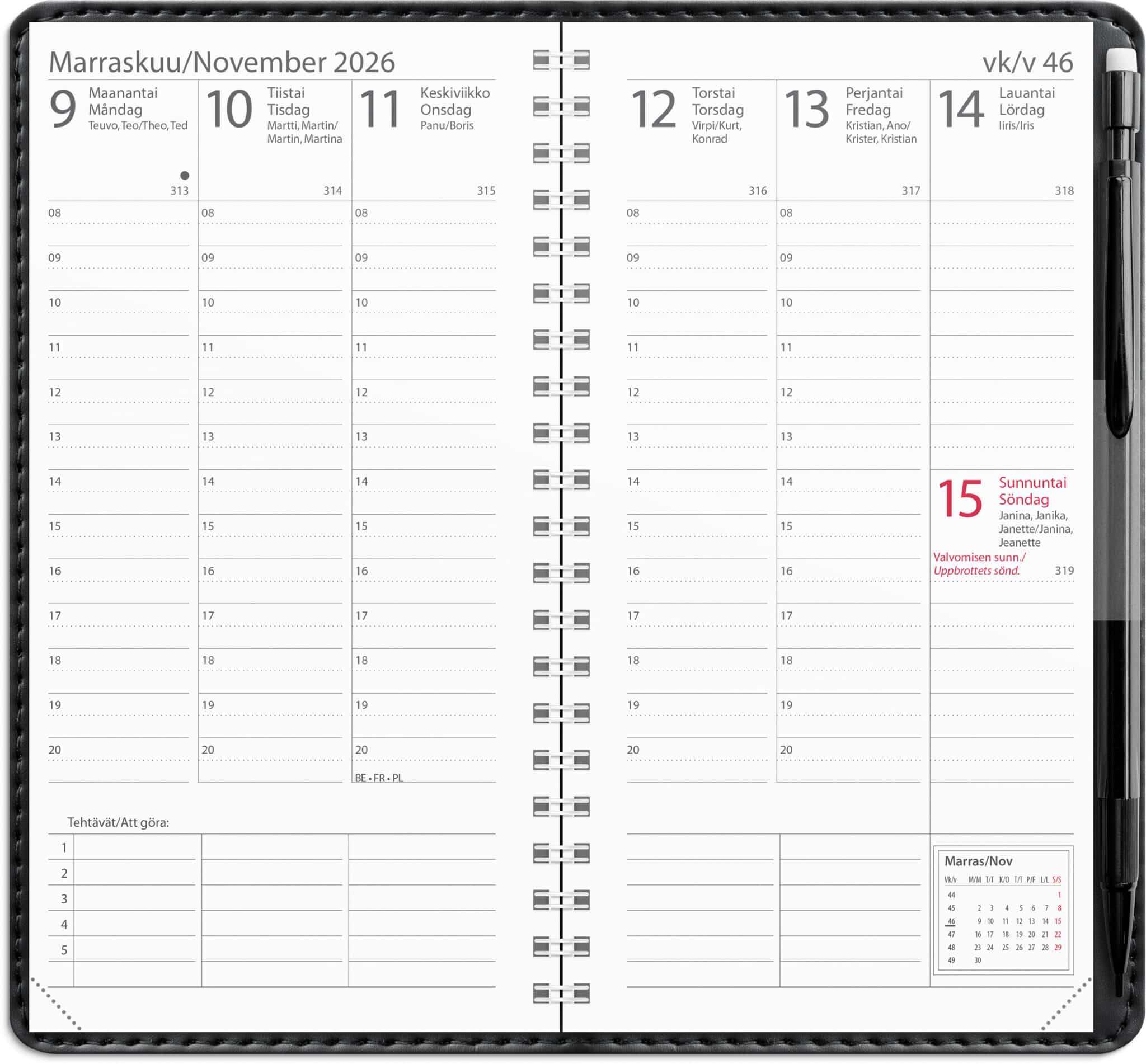 - Kalenteri sisältää nimipäivät, kansalliset pyhäpäivät, liputuspäivät, kuun vaiheet, vuosisuunnitelmat kuluvalle ja seuraavalle vuodelle, Suomen kartta, välimatkataulukon, kalendaariset tiedot, yleiset pyhäpäivät Euroopassa