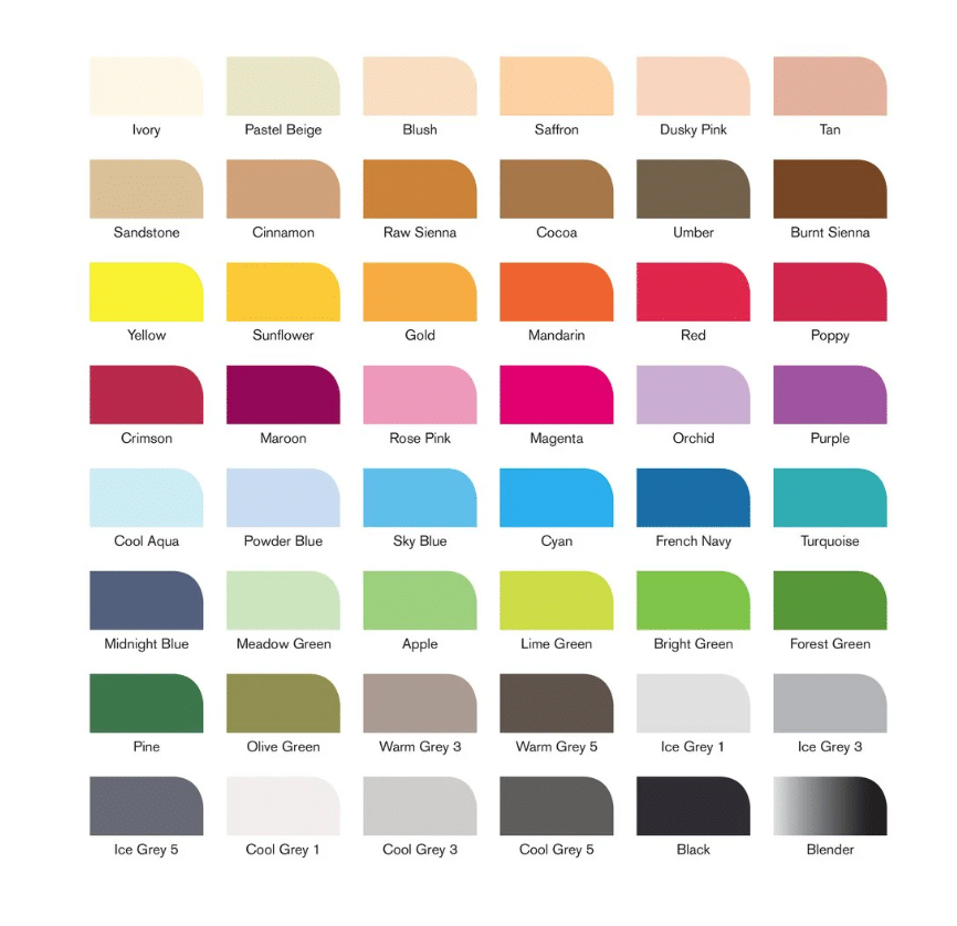 - Sisältyvät värit: Ivory, Pastel Beige, Blush, Saffron, Dusky Pink, Tan, Sandstone, Cinnamon, Raw Sienna, Cocoa, Umber, Burnt Sienna, Yellow, Sunflower, Gold, Mandarin, Red, Poppy, Crimson, Maroon, Rose Pink, Magenta, Orchid, Purple, Cool Aqua, Powder Blue, Sky Blue, Cyan, French Navy, Turquoise, Midnight Blue, Meadow Green, Apple, Lime Green, Bright Green, Forest Green, Pine, Olive Green, Warm Grey 3, Warm Grey 5, Ice Grey 1, Ice Grey 3, Ice Grey 5, Cool Grey 1, Cool Grey 3, Cool Grey 5, Black & Blender white