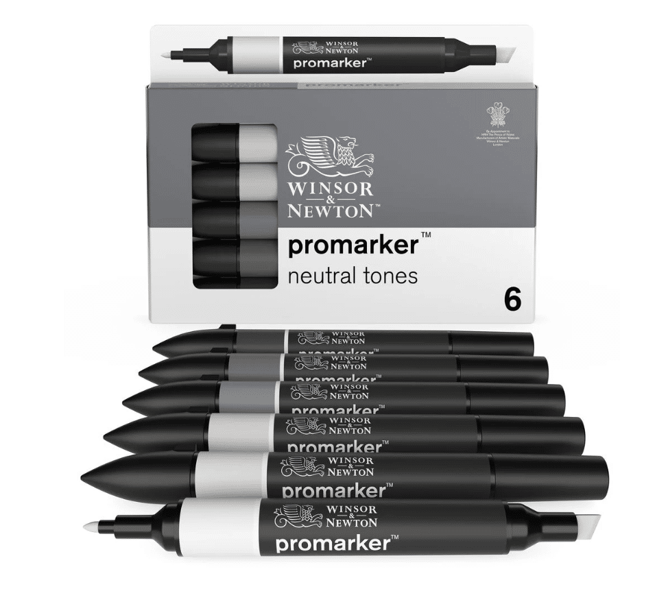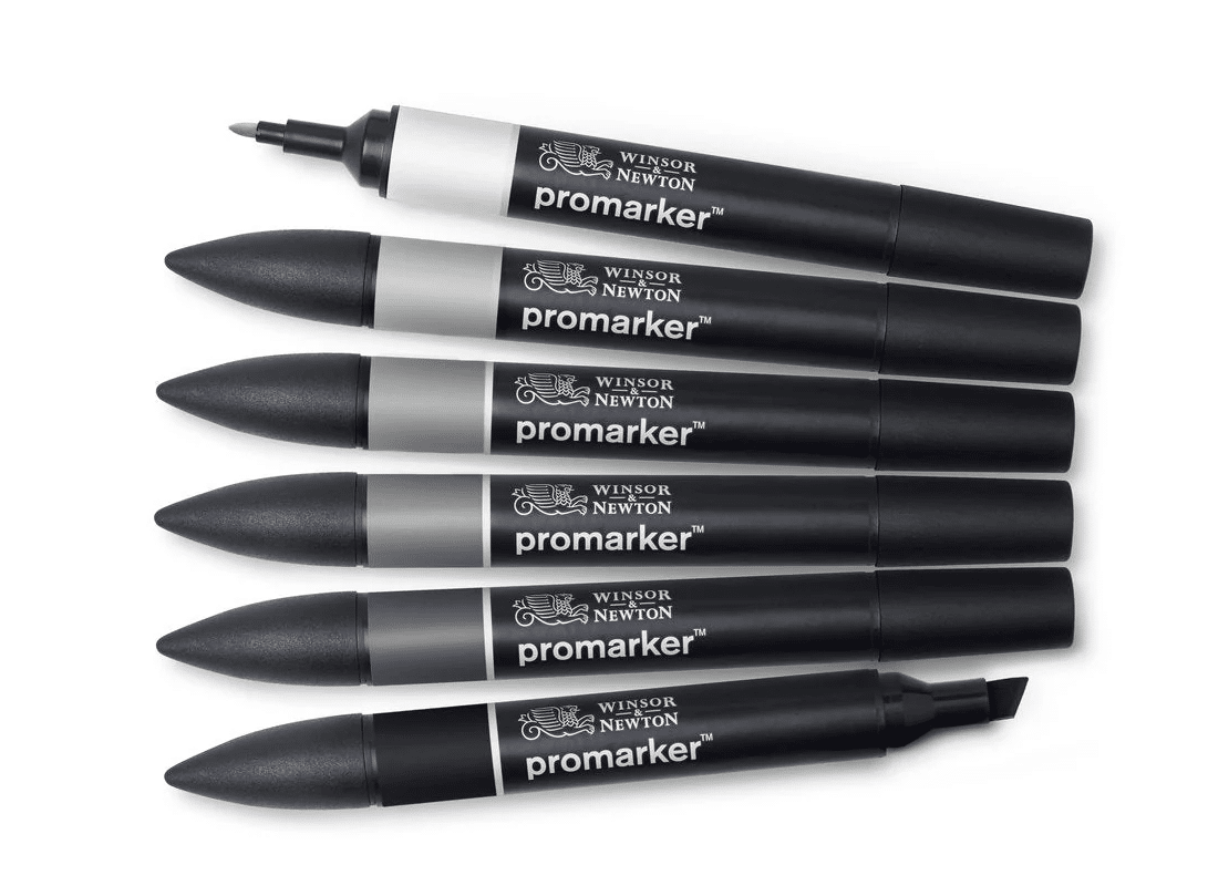 Tämä kuuden harmaasävyinen sarja sisältää kaikki viisi viileän harmaan sävyä, ja sitä täydentää Promarkerin vakioväri: musta.