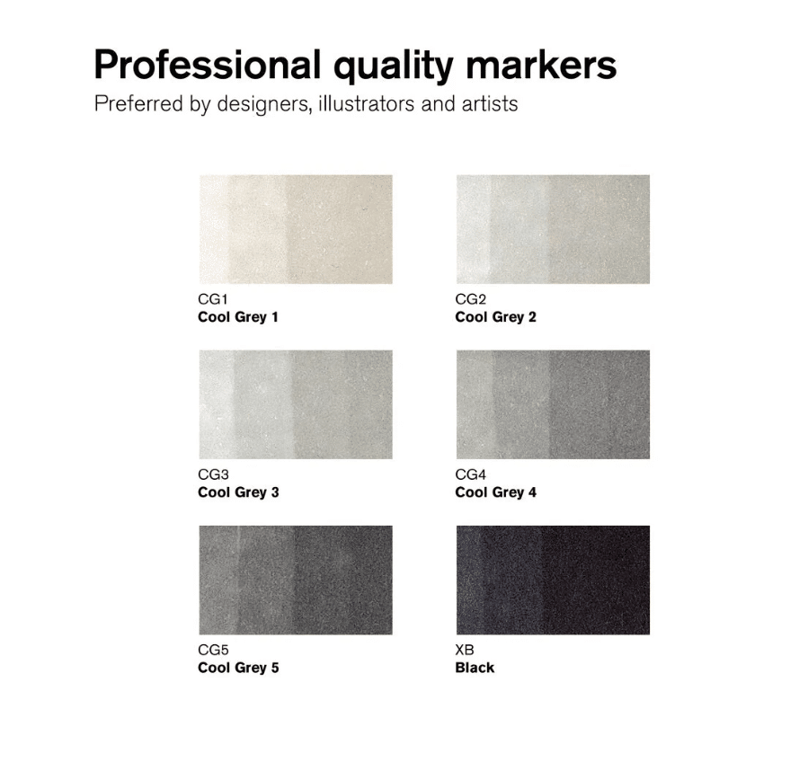 Lajitelmaan sisältyvät värit: Cool Grey 1, Cool Grey 2, Cool Grey 3, Cool Grey 4, Cool Grey 5 & Black