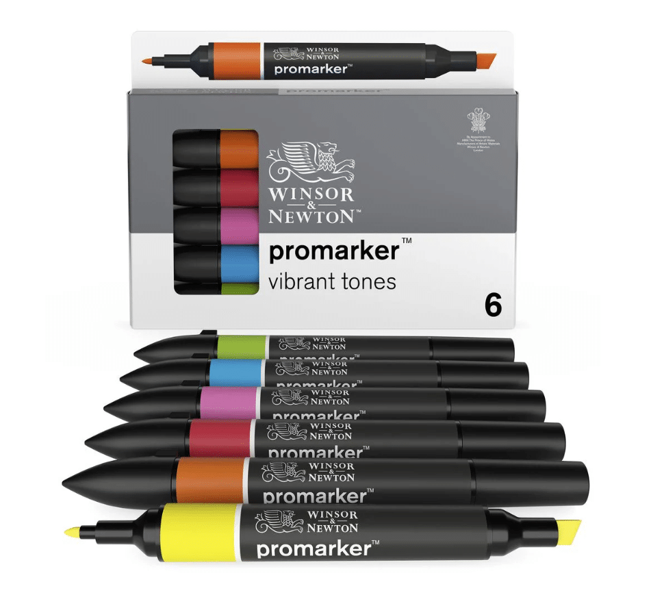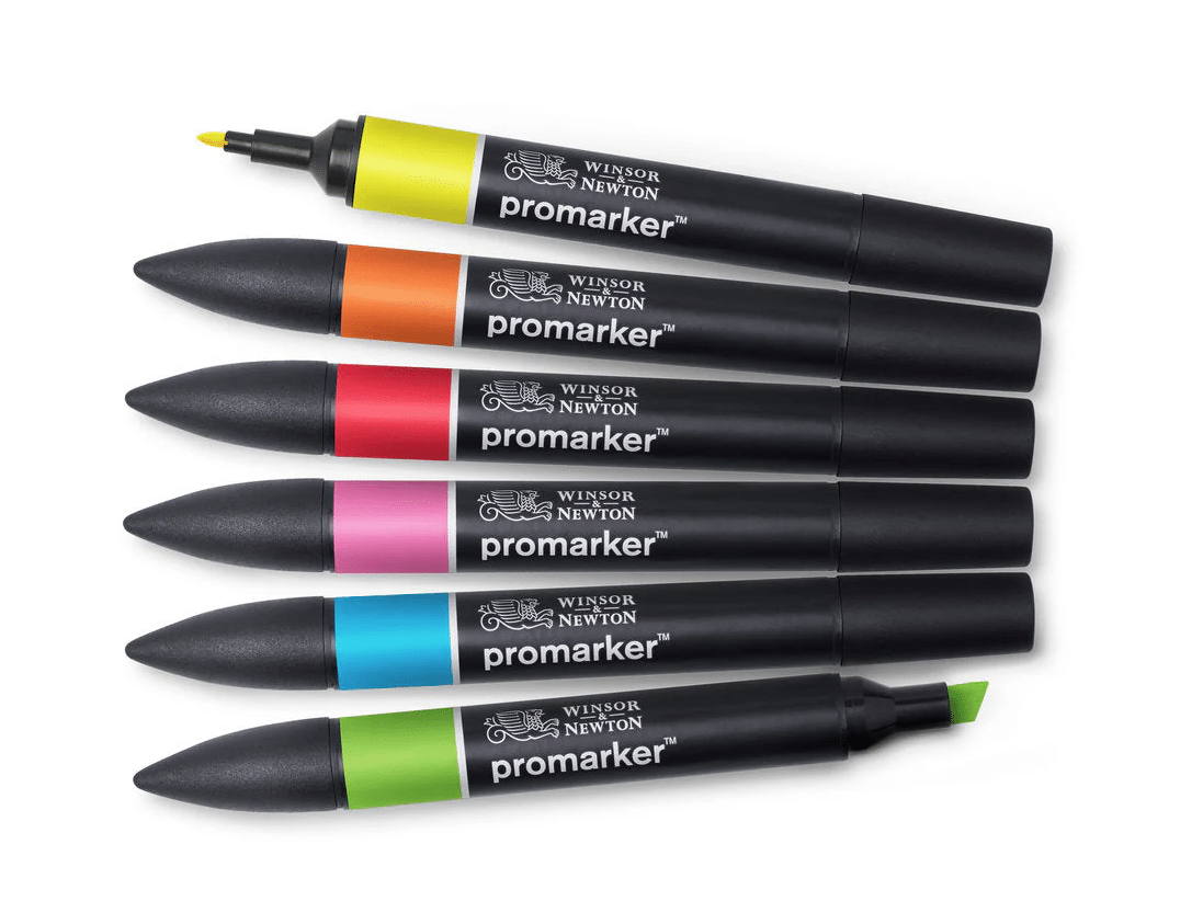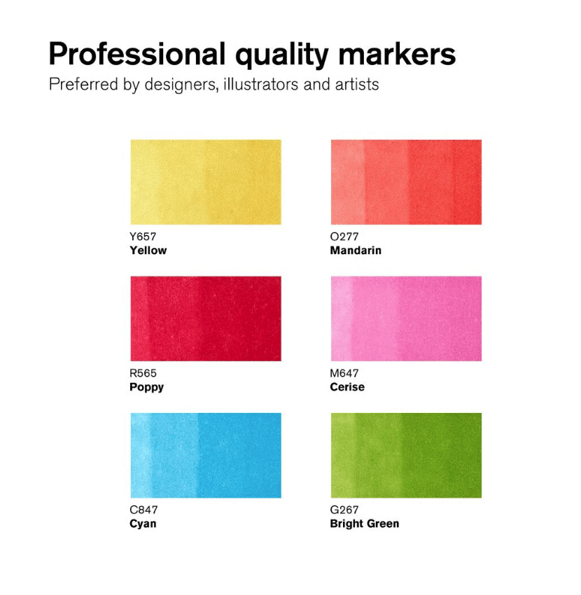 Poppy, Mandarin, Cyan, Bright Green, Yellow & Cerise ovat Promarkerin laajemman värispektrin eloisimpia värejä. Yhdessä ne muodostavat intensiivisen paletin, joka sopii täydellisesti kirkkaimpiin sommitelmiin.