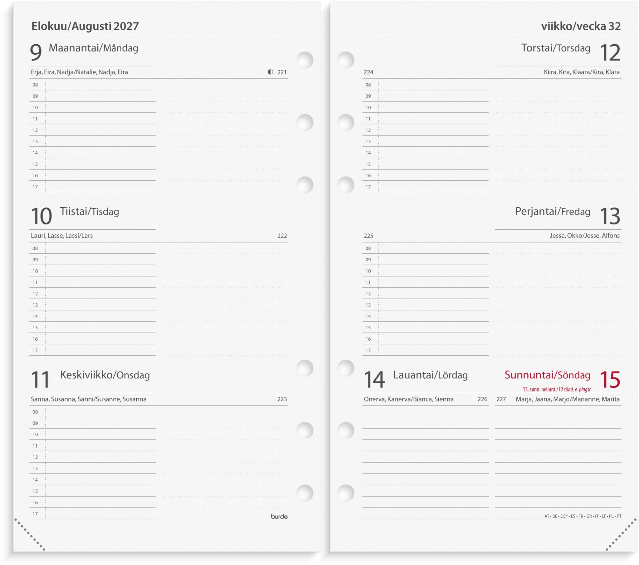 - Kalenteri sisältää nimipäivät, liputuspäivät, kansalliset pyhäpäivät, yleiset pyhäpäivät Euroopassa ja muistiinpanosivut