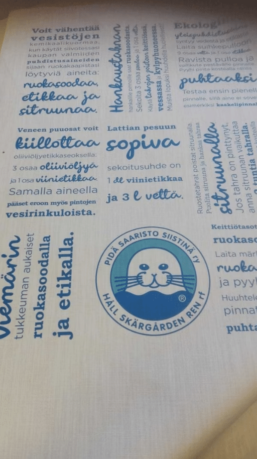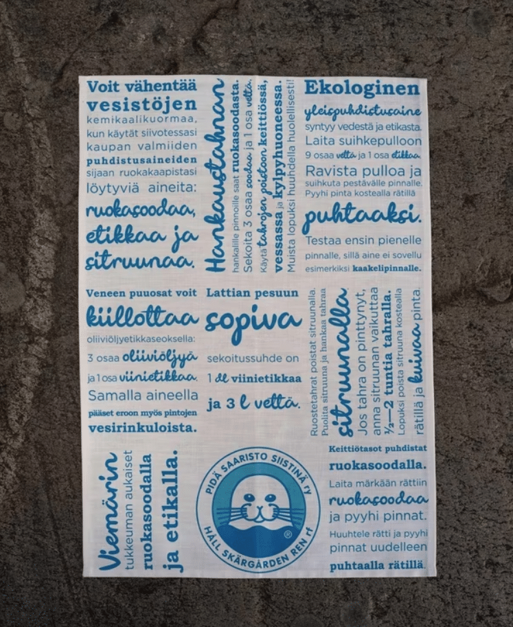- 100 % pellavasta valmistettuun pyyhkeeseen on painettu ympäristöystävällisiä siivousvinkkejä, joissa voit hyödyntää keittiökaapeistasi löytyviä aineksia