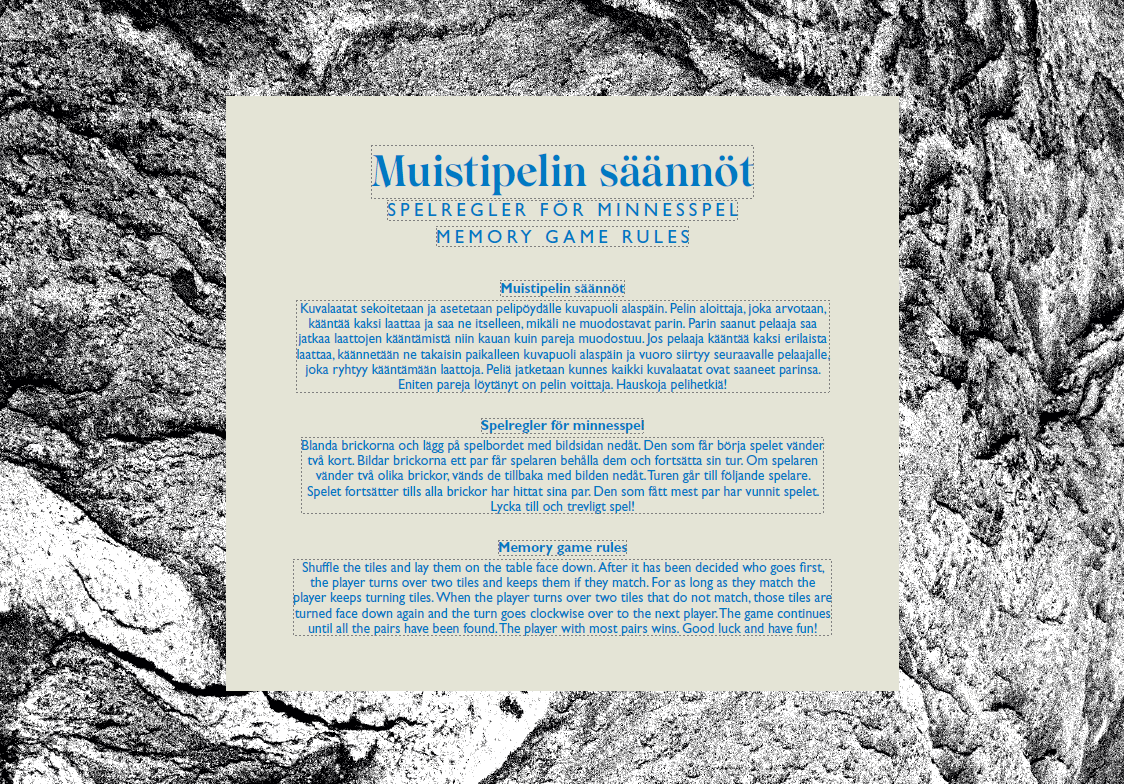 Roope-hylje on kulkenut Pidä Saaristo Siistinä ry:n tunnuksena yli 50 vuotta. Nyt Roope seikkailee myös muistipelissä ja esittelee korteissa ympäristöjärjestön työtä Itämeren ja järviemme roskaantumista ja rehevöitymistä vastaan. Ostamalla tämän pelin tuet Pidä Saaristo Siistinä ry:n työtä herkän Itämeren ja ainutlaatuisten järviemme hyväksi. Kiitos, kun autat pitämään saariston siistinä ja elinvoimaisena!