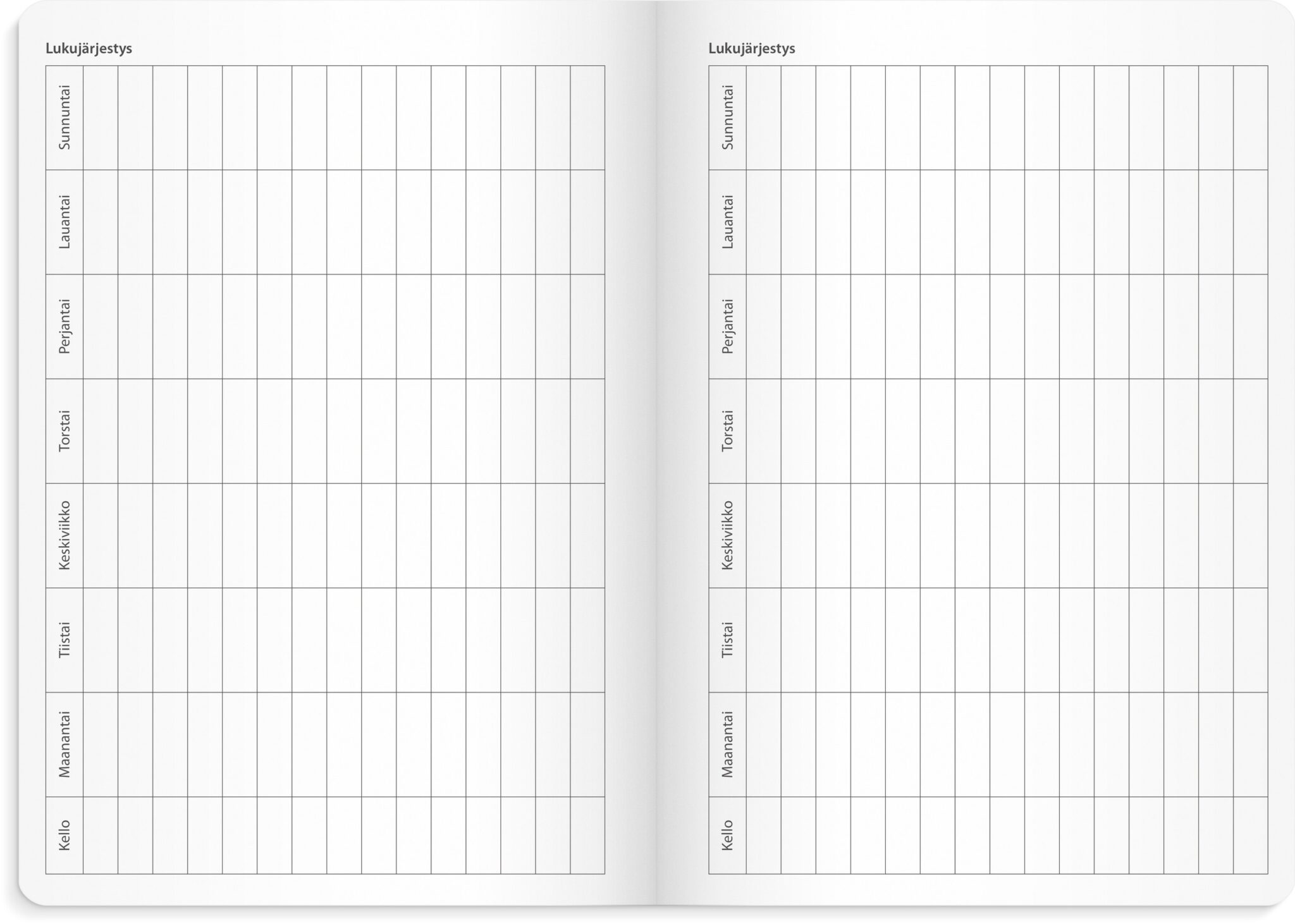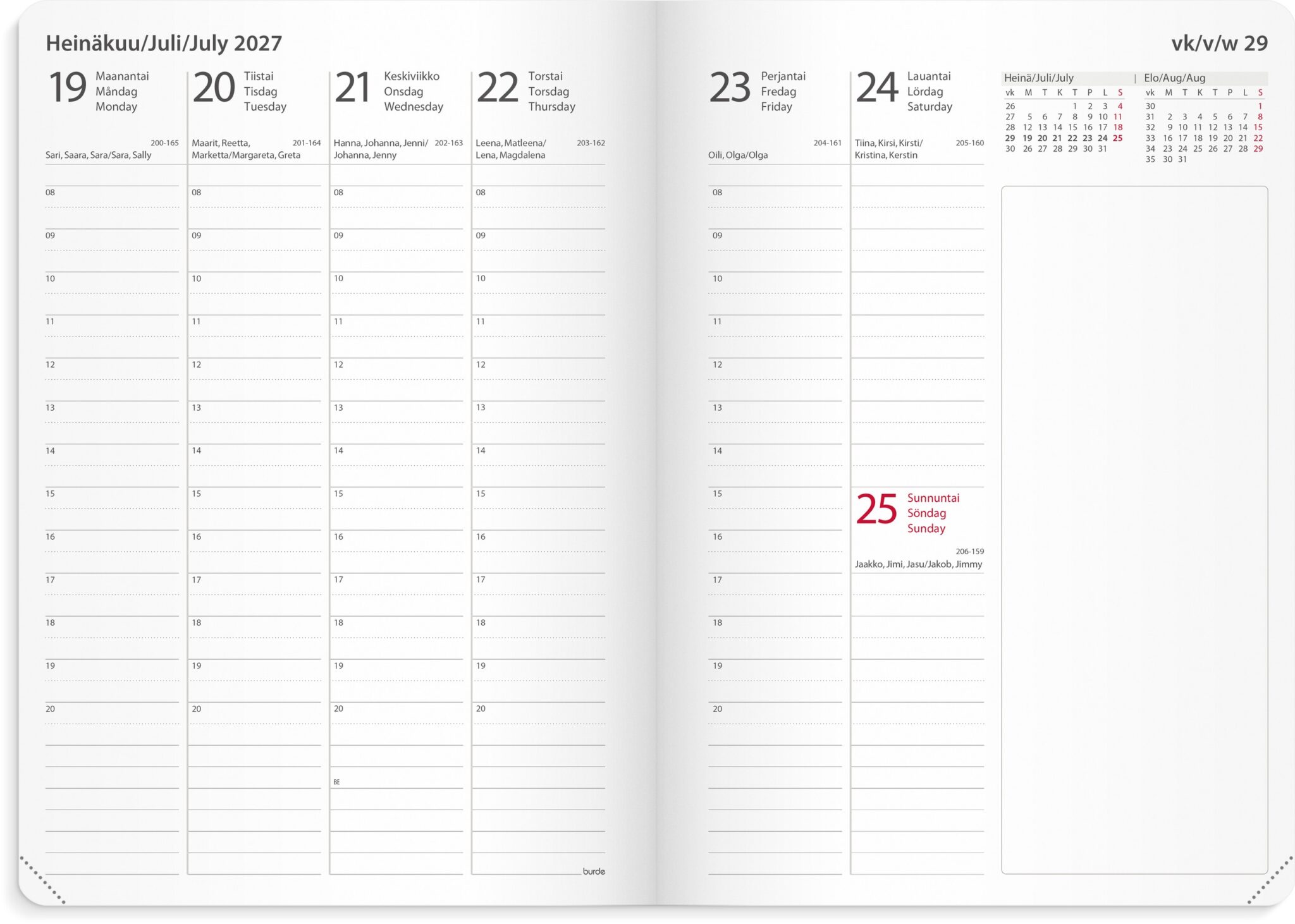 - Kalenterin aukeamalla yksi viikko, tuntijaotus 08-20, palsta muistiinpanoille, kuluvan ja seuraavan kuukauden kalenteritaulukot