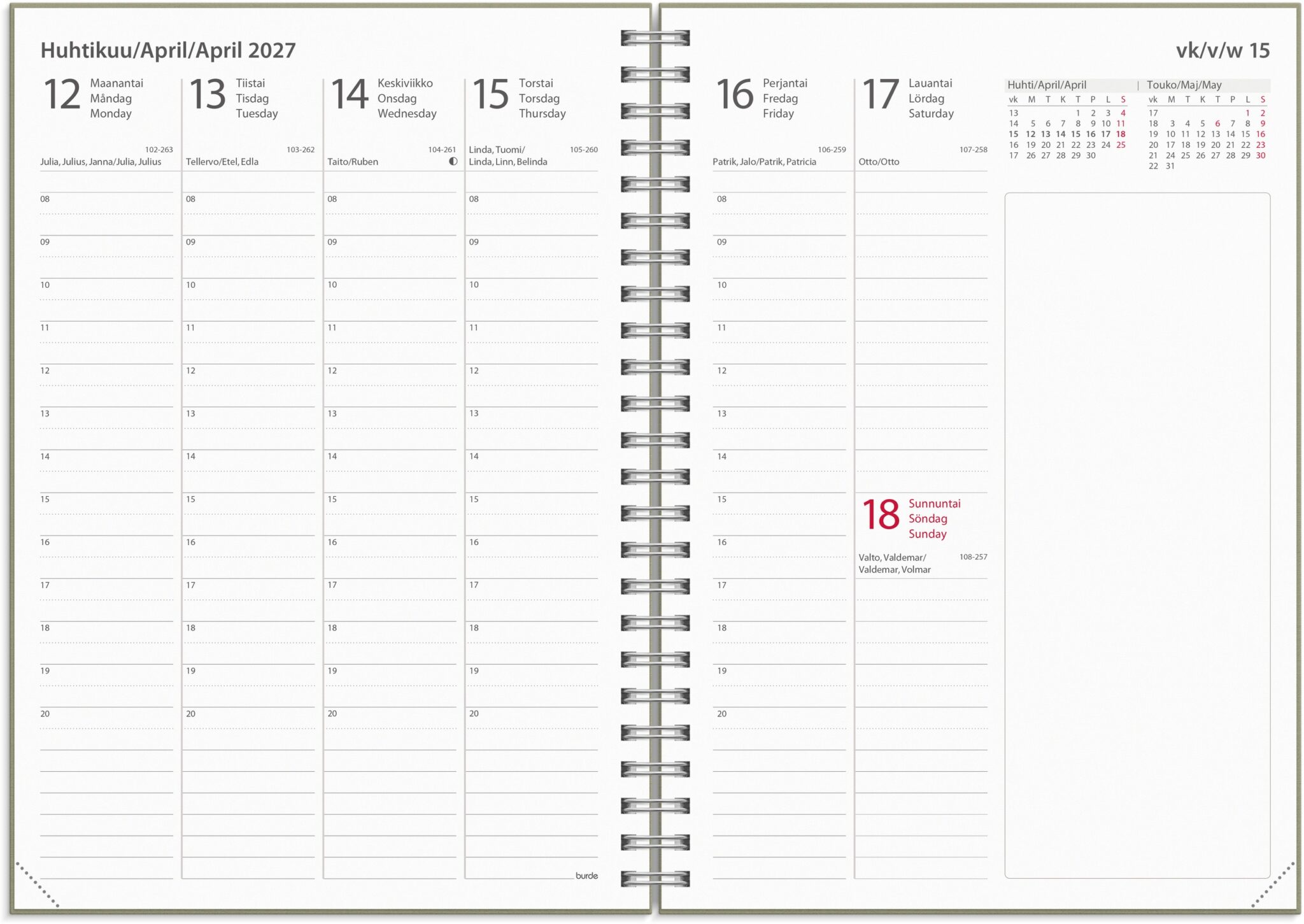 • Kalenteri sisältää nimipäivät, juhlapyhät, liputuspäivät, kuun vaiheet, vuosisuunnitelmat ajalle heinäkuu 2026 – heinäkuu 2028, tietosivut, lukujärjestykset ja muistiinpanosivut