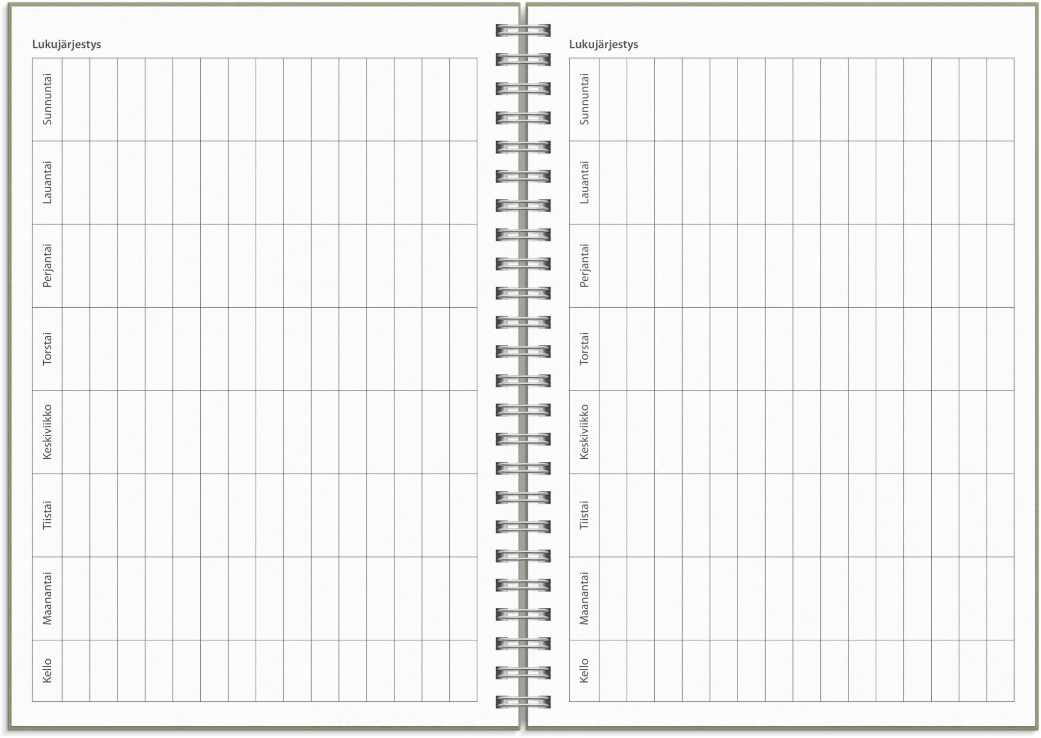 • Kalenterin aukeamalla yksi viikko, tuntijaotus 08-20, palsta muistiinpanoille, kuluvan ja seuraavan kuukauden kalenteritaulukot
