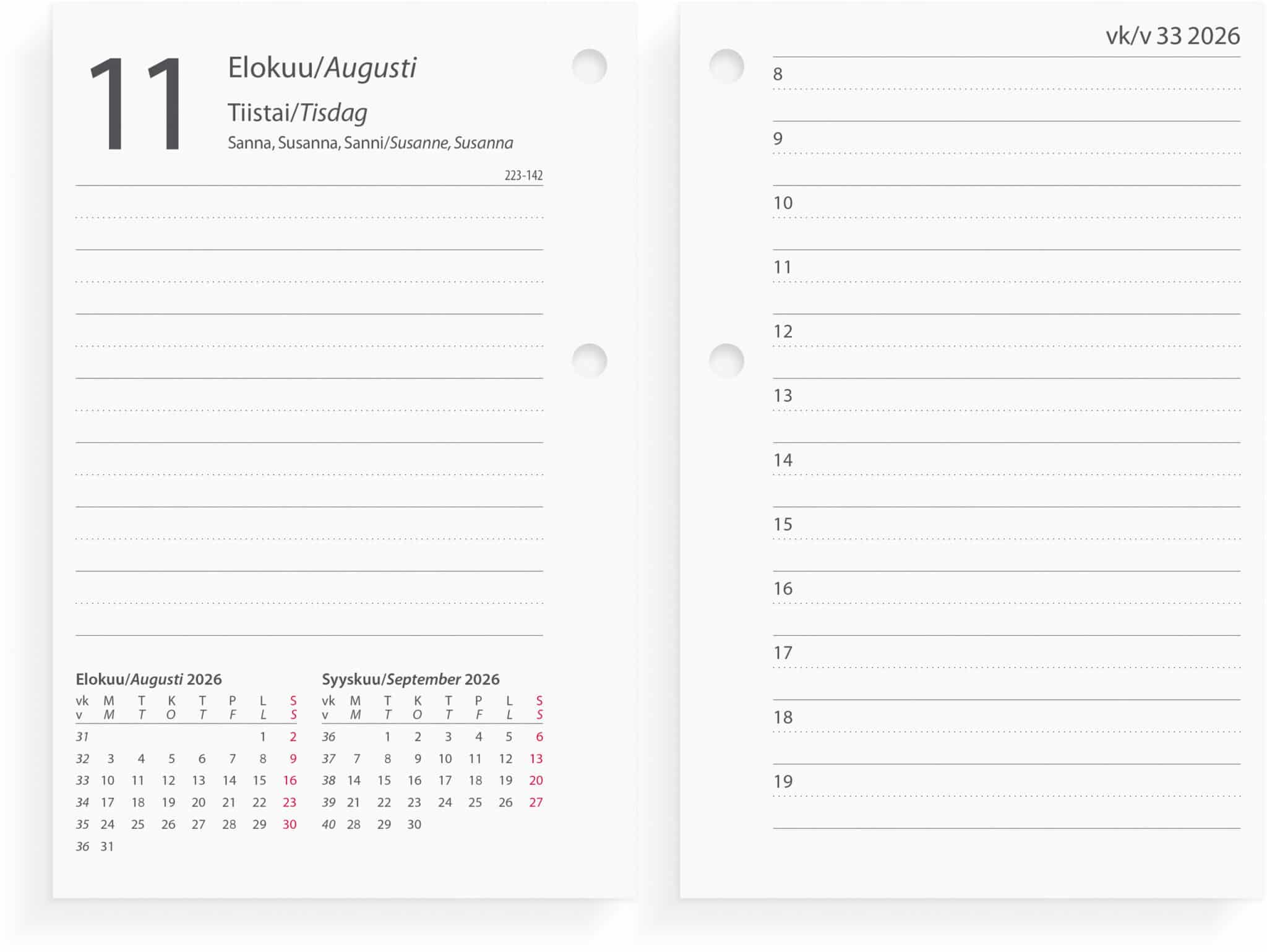 - Kalenteri sisältää nimipäivät, kansalliset pyhäpäivät, liputuspäivät, kuun vaiheet, vuosiruudukot kuluvalle ja seuraavalle vuodelle
