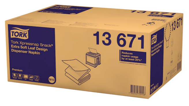 Tork Xpressnap Snack® Premium lautasliina on suunniteltu itsepalveluravintoloihin, joissa pieni lautasliina riittää. Järjestelmä auttaa vähentämään lautasliinojen kulutusta vähintään 25 % perinteisiin lautasliina-annostelijoihin verrattuna. 2-kerroksiset Tork Xpressnap Snack® Extra Soft lehtikuvioidut annostelijaliinat sopivat erinomaisesti yrityksille, jotka kaipaavat käteviä ratkaisuja ja haluavat antaa laadukkaan vaikutelman vahvojen ja tyylikkäiden lautasliinojen avulla.